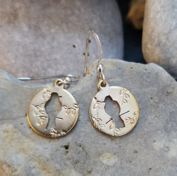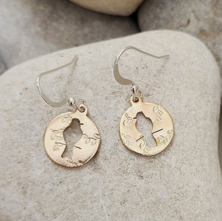 Brass circles, 19mm across. Hand pierced bird on a branch design cut into the discs. A random leaf imprint added to the front surface. Sterling silver ear wires.