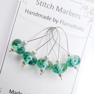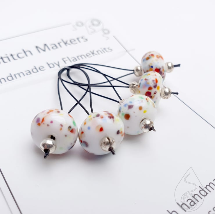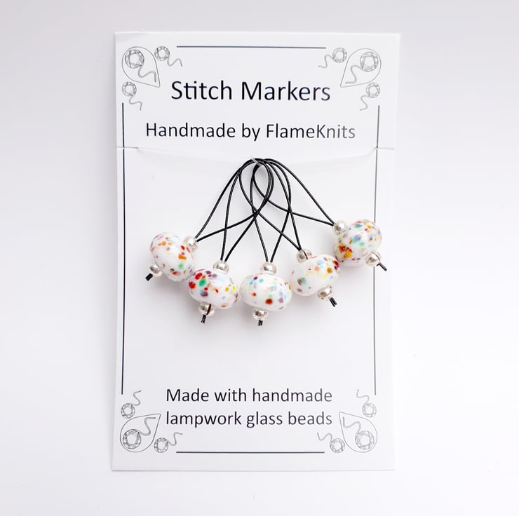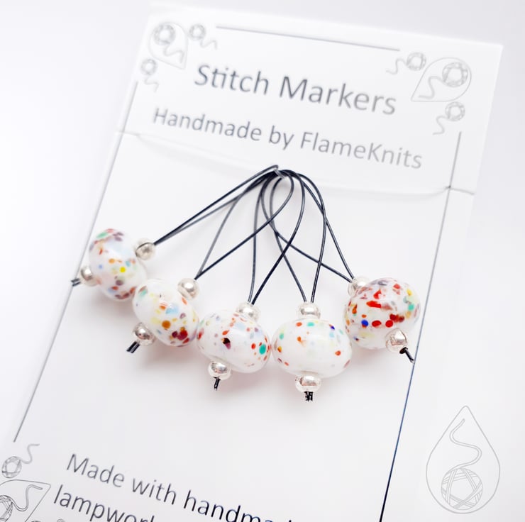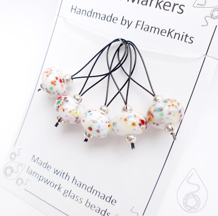 A set of 5 stitch markers made with multicoloured lampwork glass beads.