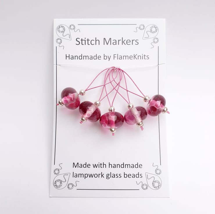 A set of 5 stitch markers made with lampwork glass beads in shades of pink.