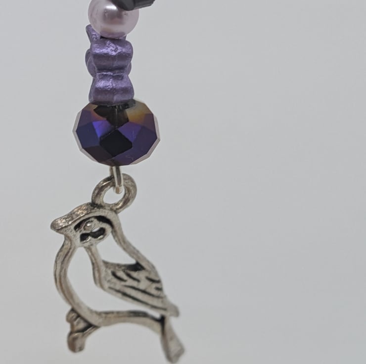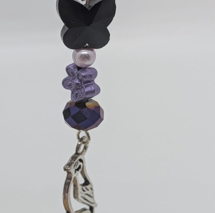 A one of a kind pair of earrings with black and purple beads and a metal bird charm. The purple iridescent bead catches the light and makes these earrings shine.
