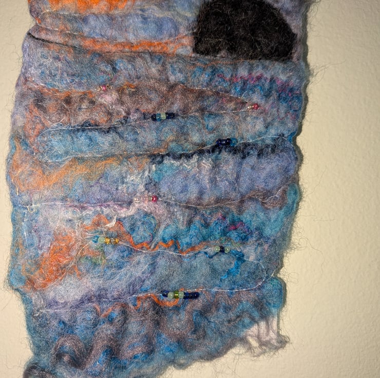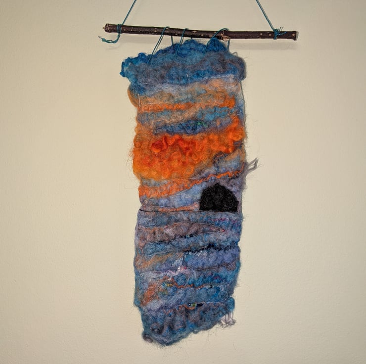 The stunning colours of sunset on the Ayrshire coast captured in a wet felted and beaded wall hanging.