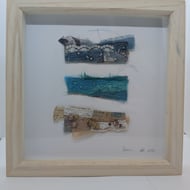 Wet felted in merino wool and silk scraps, machine embroidered and embellished with glass seed beads, this delightful wall hanging evokes a summer evening after a storm, sitting by the sea and enjoying the calm.