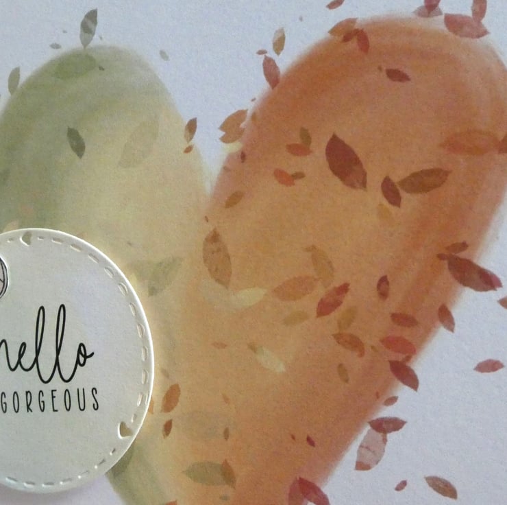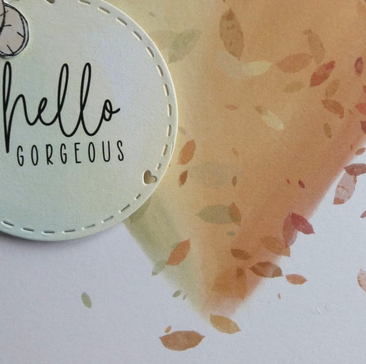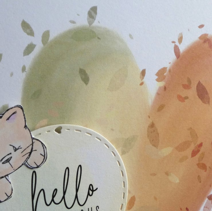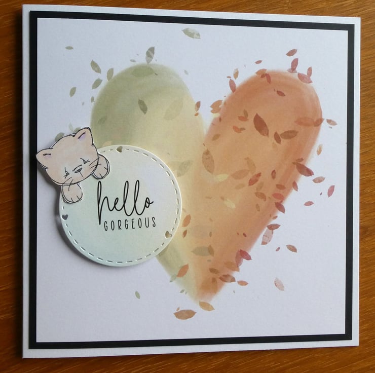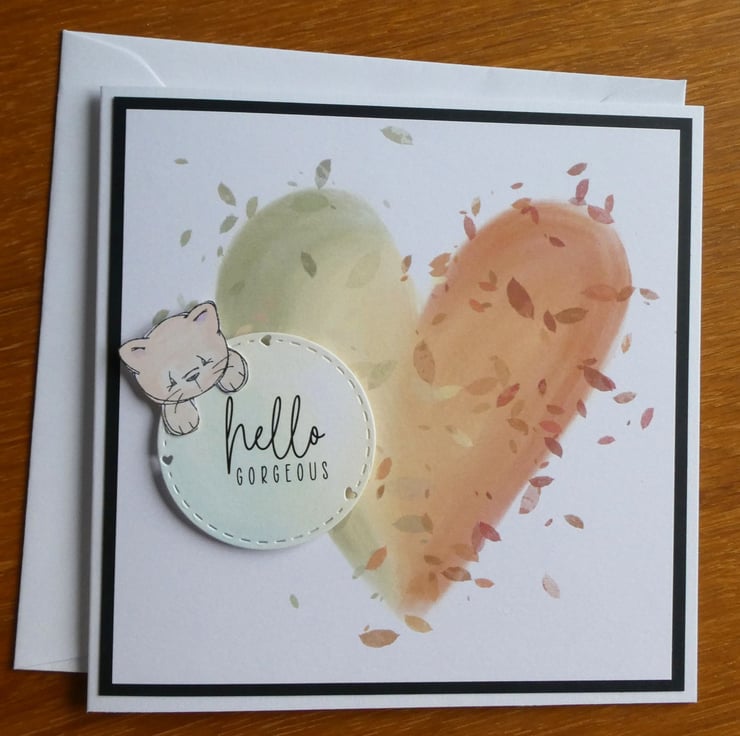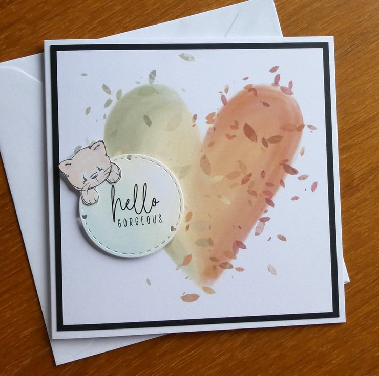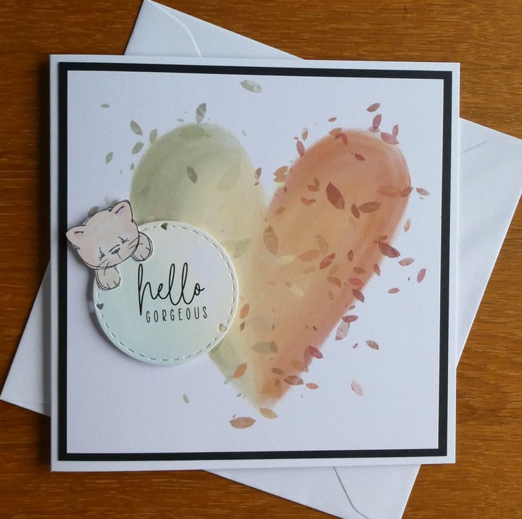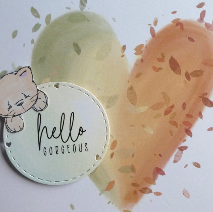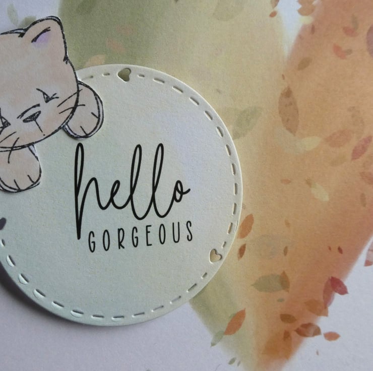 It features a cute cat which has been hand stamped, inked in shades of orange and cream and carefully cut. It has been positioned to be looking over a circular die cut message printed with the words 'hello gorgeous' on a pale lemon and green background.
