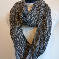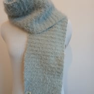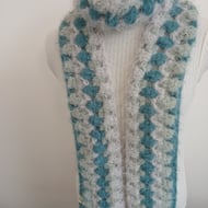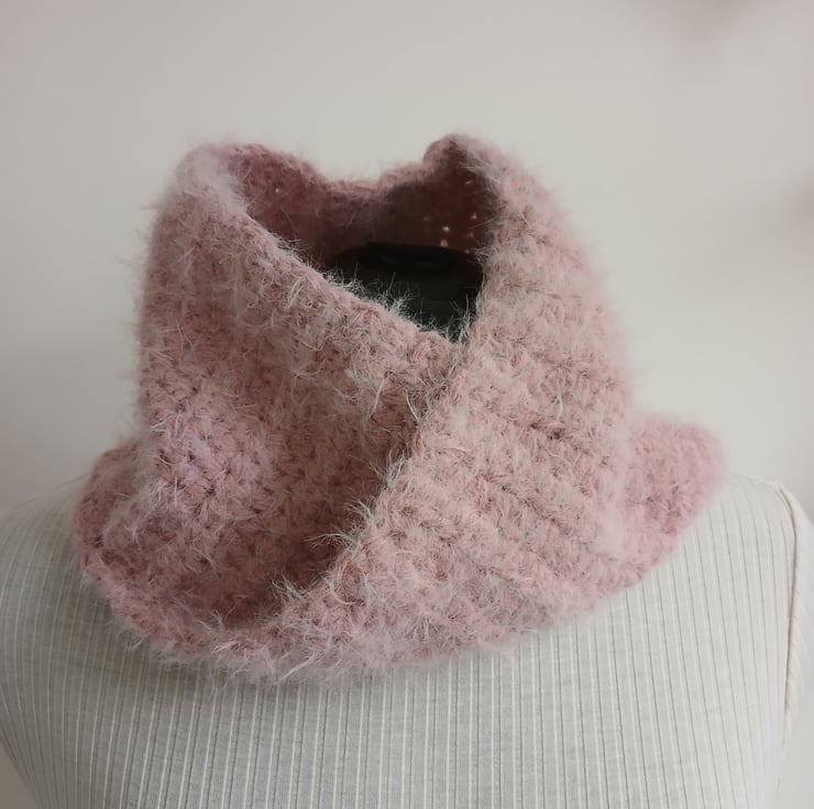 Hand crocheted cashmere-feel 100% polyester twist cowl.