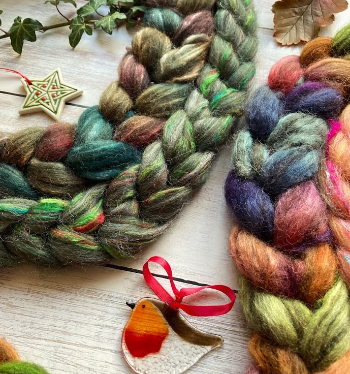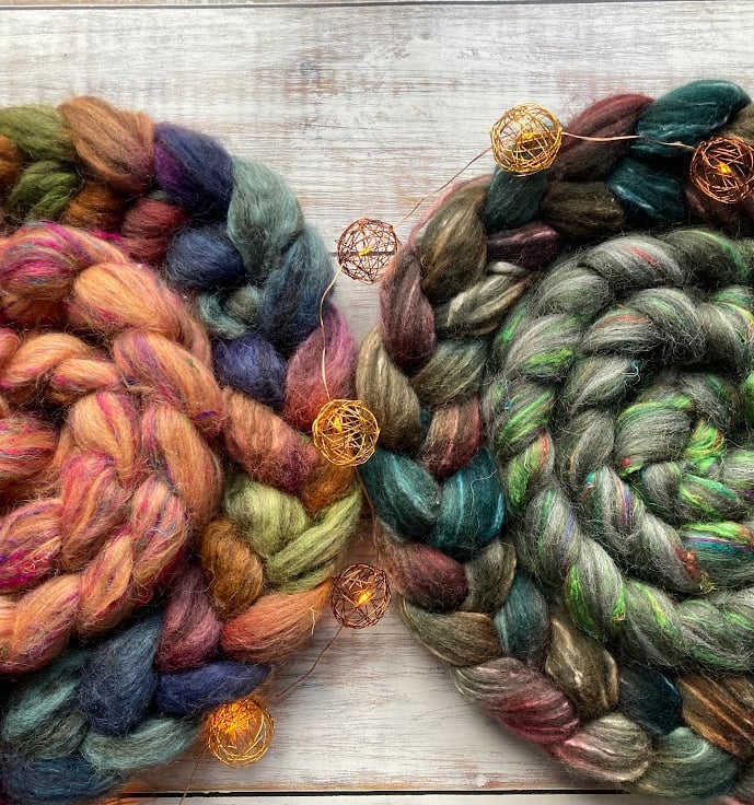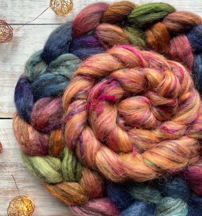 50g each of Albion home grown fibres and three shades of soft recycled wools with dashes of sari silk.