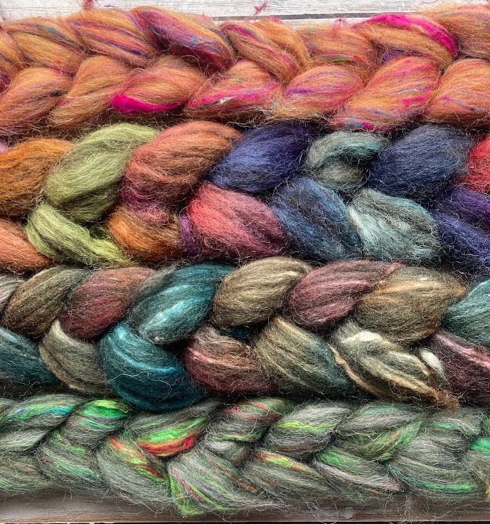 Albion and Pine Ridge hand dyed by me as shown and the others are commercially blended.