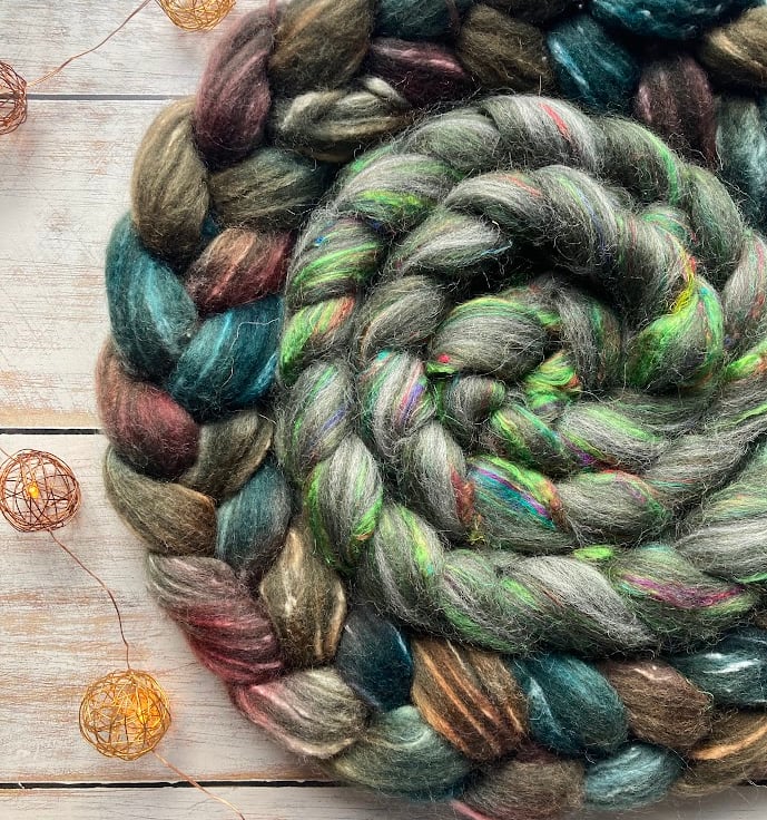 A mix of Shetland moorit, Black Welsh, Cotswold, grey Teeswater and grey Massam. Blended skilfully together by Tom and Ellie at Wingham Wool to make a fantastic medium heathered fibre with both a beautiful crimp and sheen.