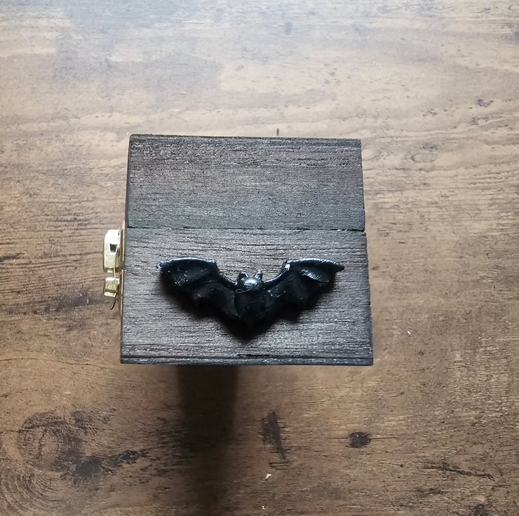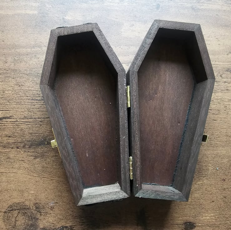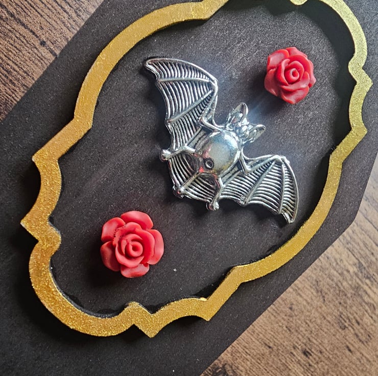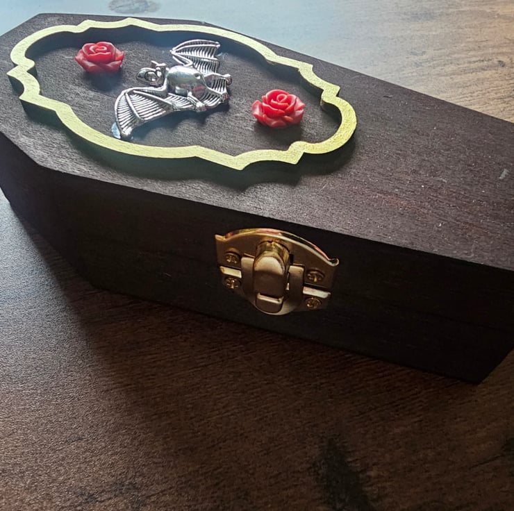 Coffin shaped wooden jewellery or trinket box, with silver metal bat and resin red rose embellishment. The box fastens with a hook and eye closure and has a bat bat on each short end of the box.
