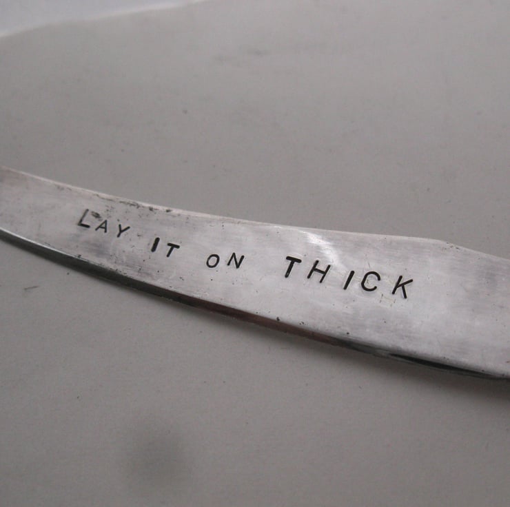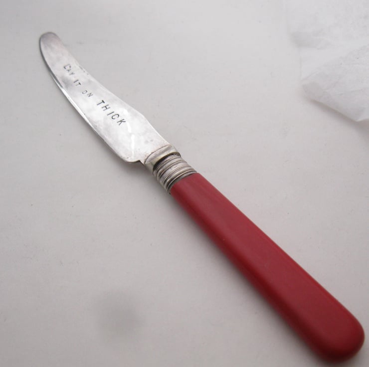 I've hand stamped LAY IT ON THICK onto a vintage butter spreader with a red celluloid (or at least, an early plastic of some sort) handle and a silver-plated round-ended blade. A great letterbox gift for a butter-lover!