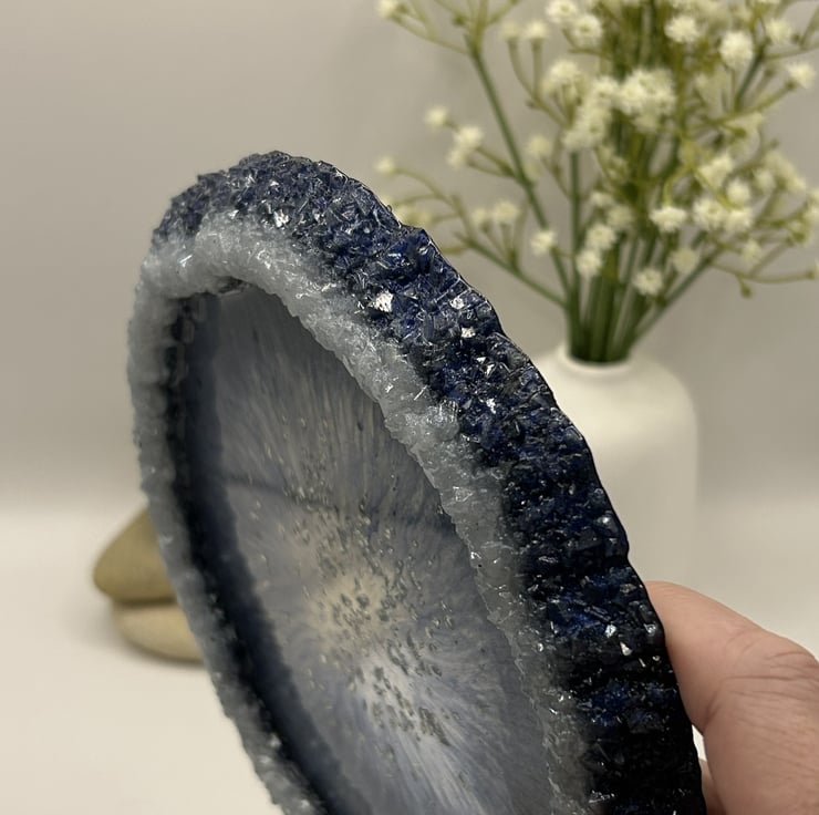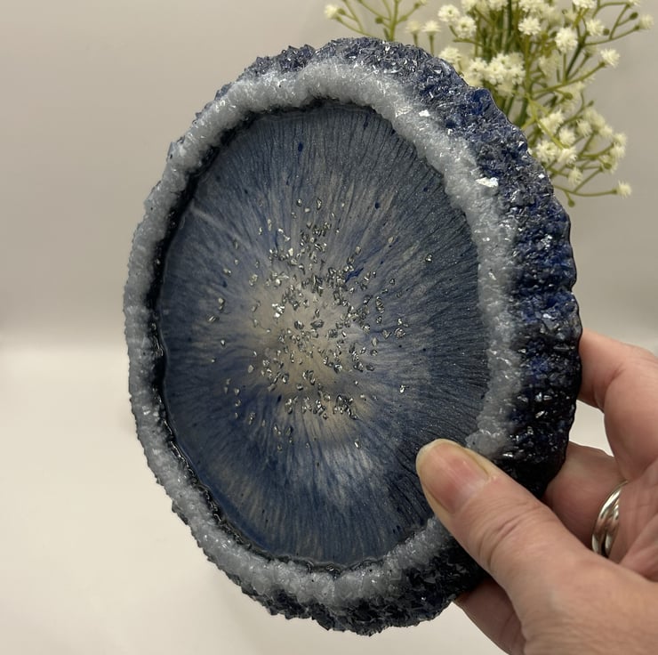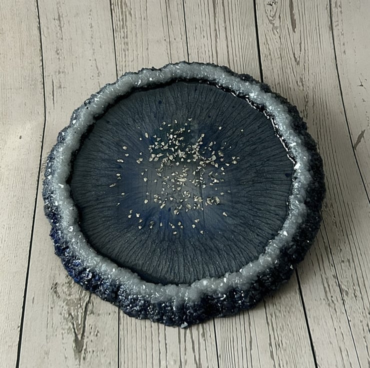 Add a touch of shimmer to your home with my handmade drusy edge resin trays. Each piece features a mesmerising centre or a sparkling crystal effect rim, creating a design that is both beautiful and practical. At around 7.25 inches across it works perfectly as a catchall trinket dish candle holder or table accent.
