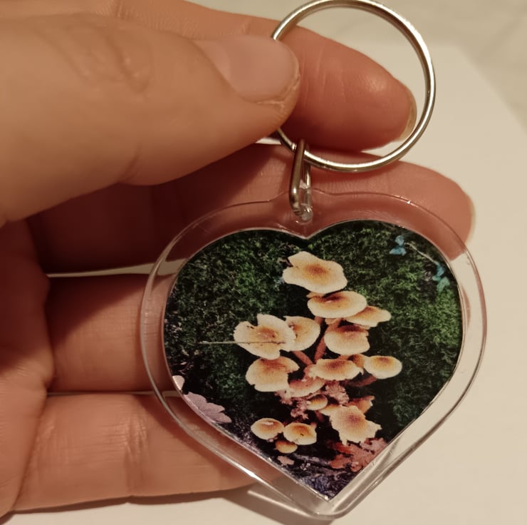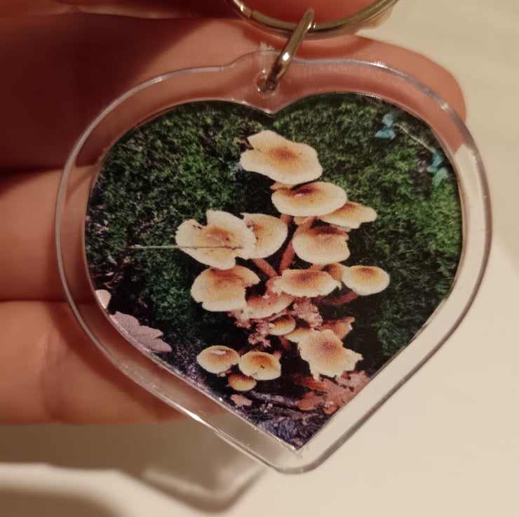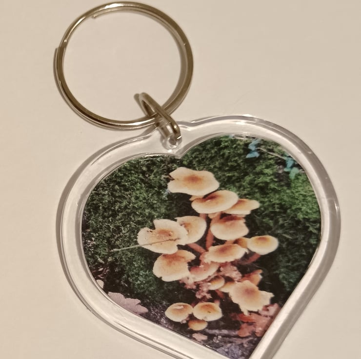 Beautifully detailed wild mushroom photography placed within a heart shaped keyring. Photography taken by myself. Opposite side is blank.