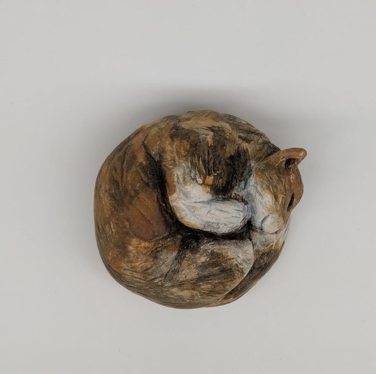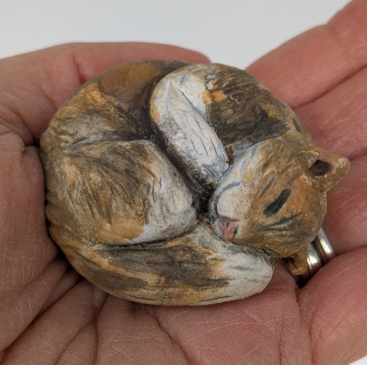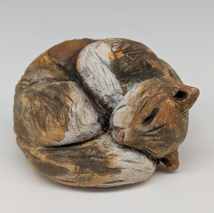 A mini curled cat handmade in stoneware clay!