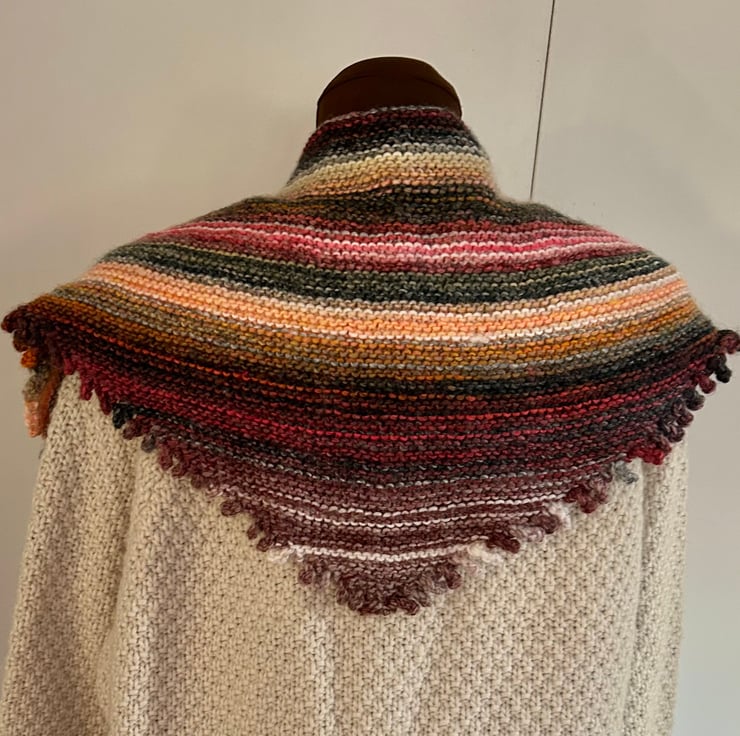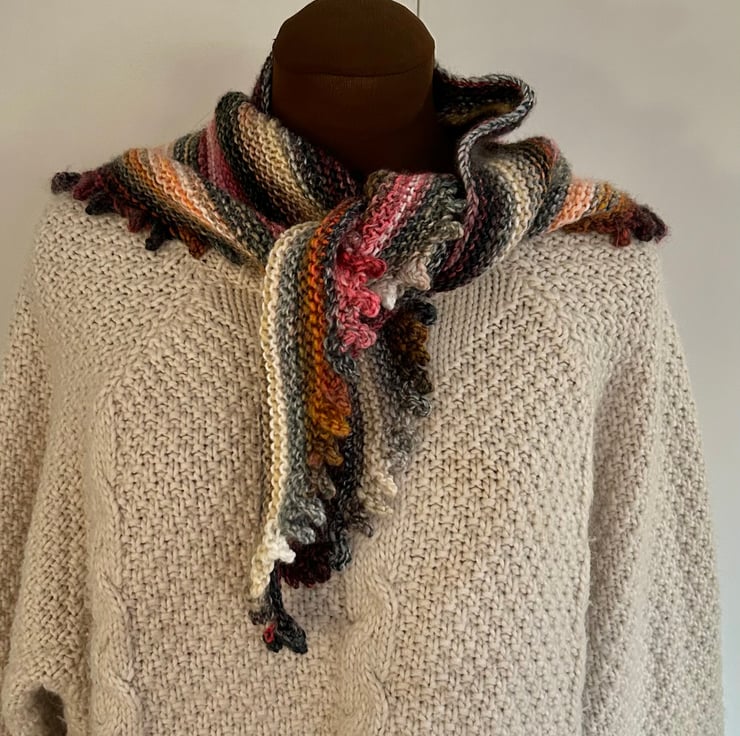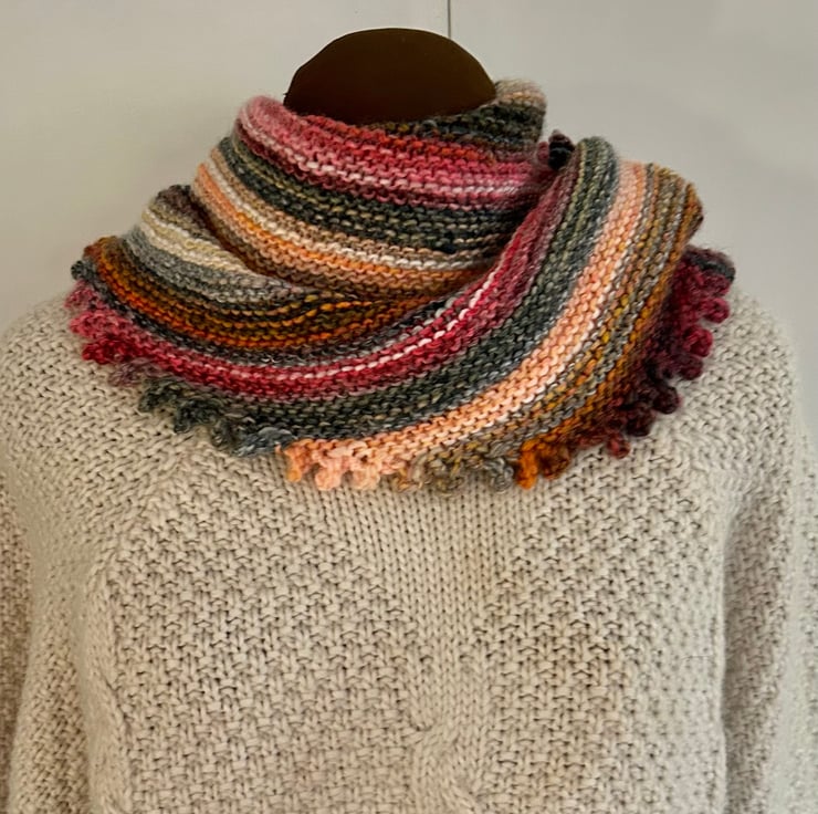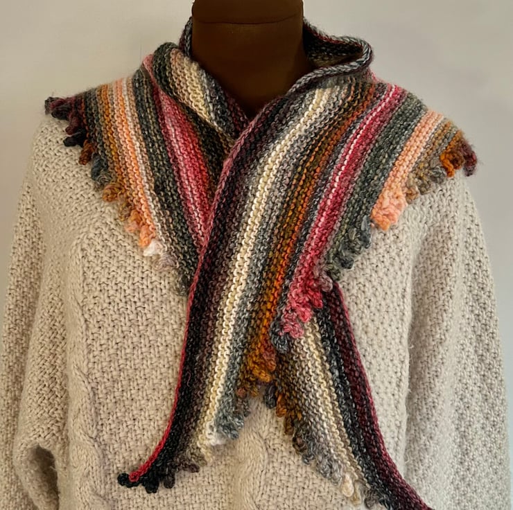 Knitted in a soft variegated yarn it can be worn draped loosely or wound around your neck. It measures 33cm x 63cm.