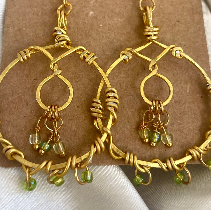 These handmade dangle earrings are a warm and rich gold tone complete with complimentary green bead detailing for an extra burst of colour.