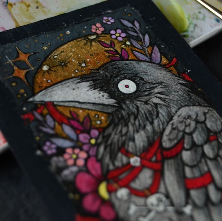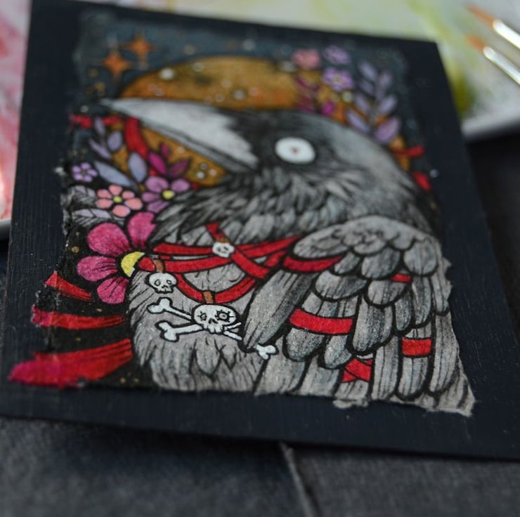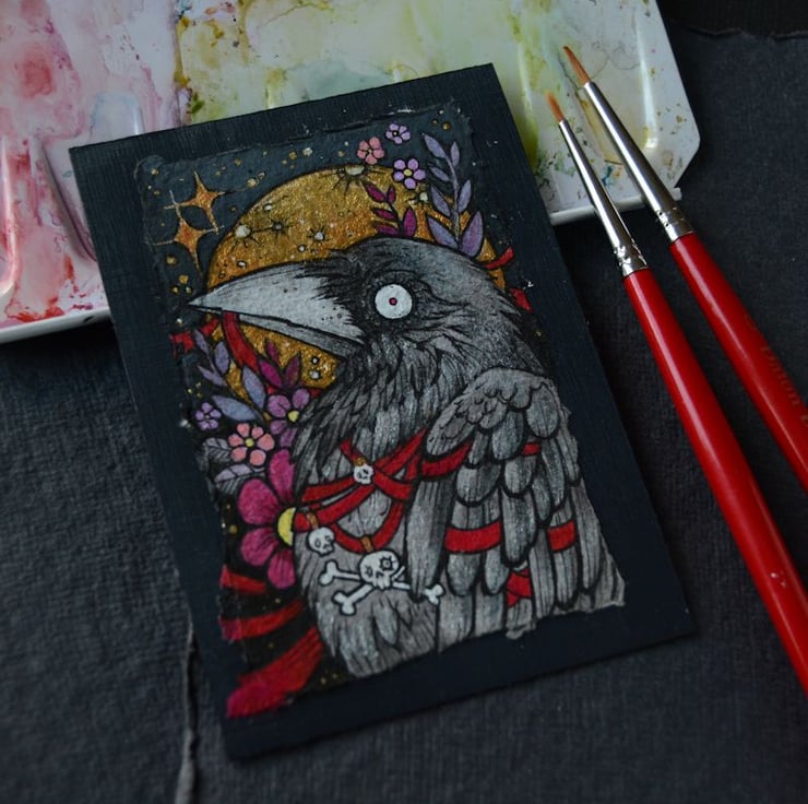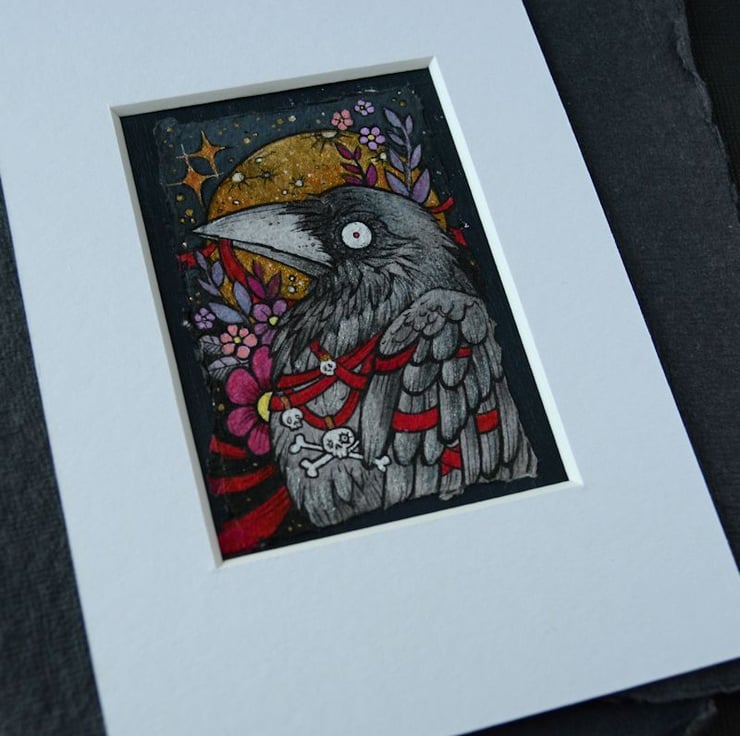 this aceo is an original artwork, hand drawn with a tiny 0.05 nibbed pen, then coloured with ink, artists pens and watercolour paints, on indian khadi paper. khadi paper is handmade from recycled cotton rag, it has a lovely textured surface and deckled edges. i have then mounted the illustration onto 300gsm cardstock, hand painted with a paynes grey to create a dark surrounding edge/background.