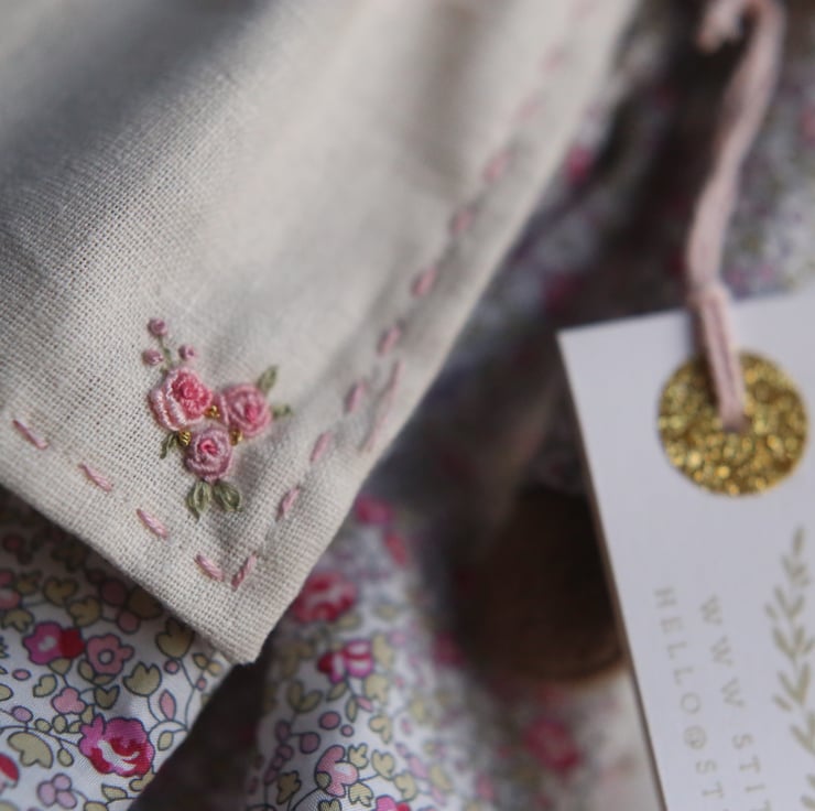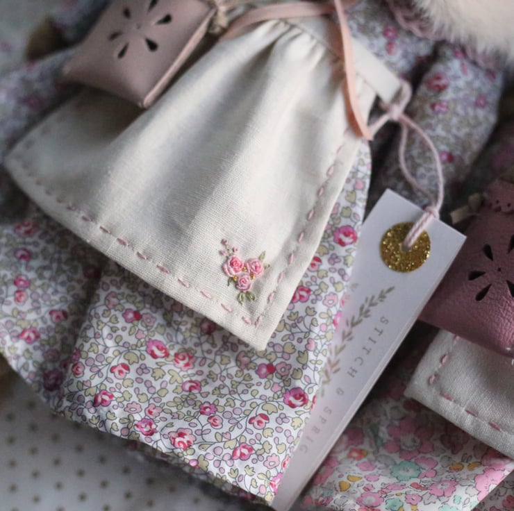 Her apron is made from cotton/linen fabric and embroidered with tiny running stitches and a little sprig of flowers.