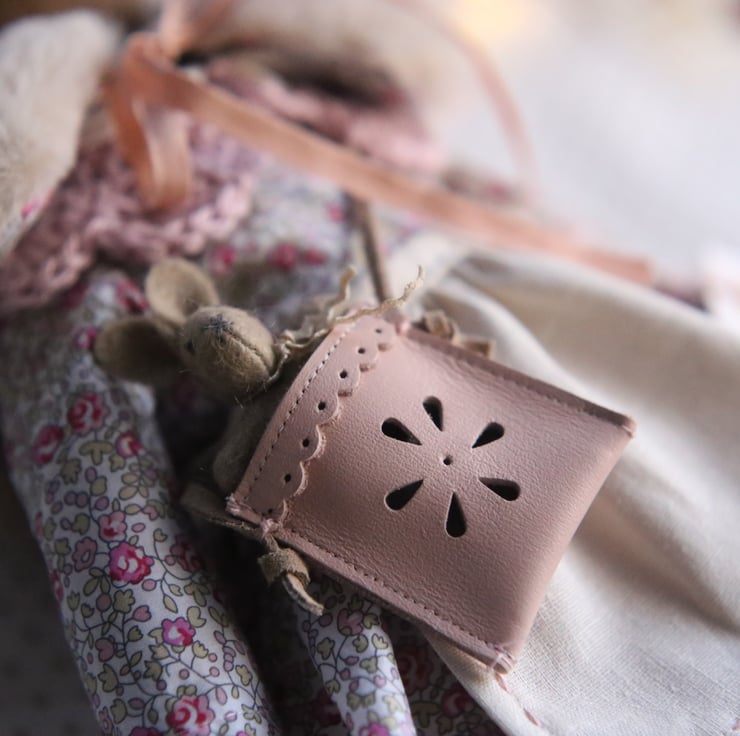 Her accessories include a tiny leather bag, hand punched with a daisy design and containing a baby bunny with a ric rac tie.