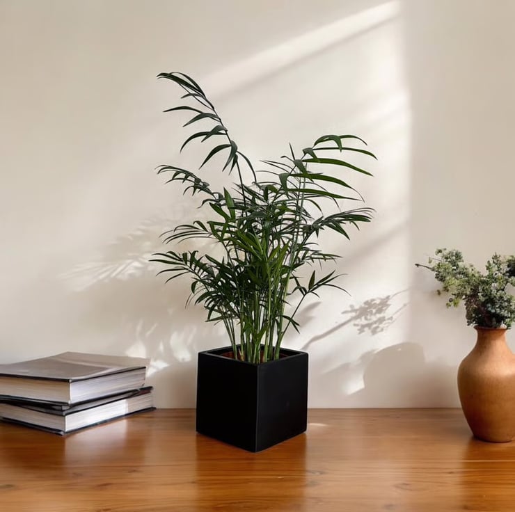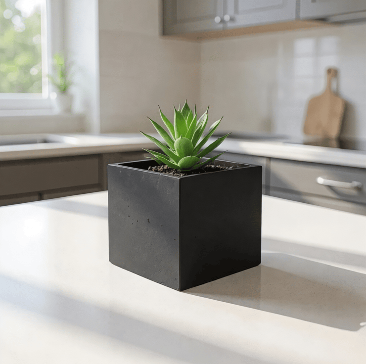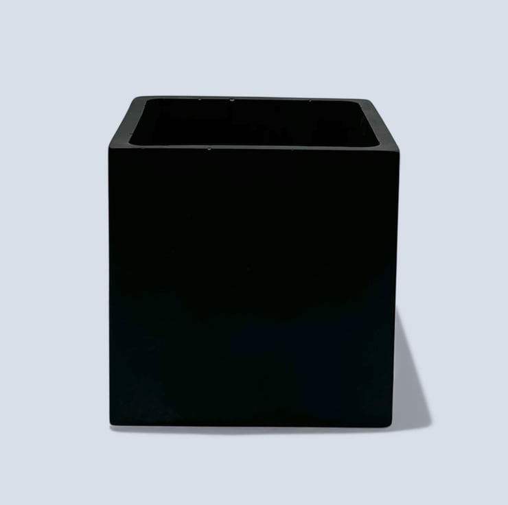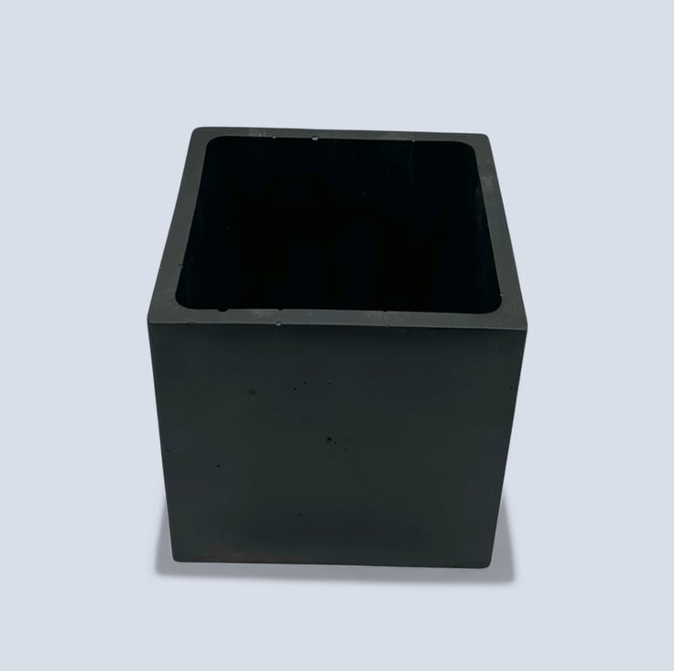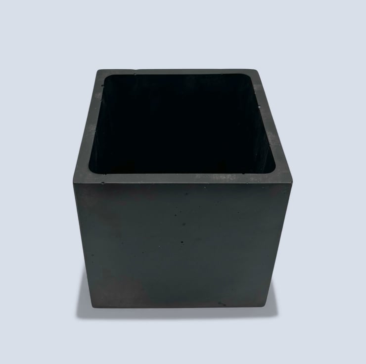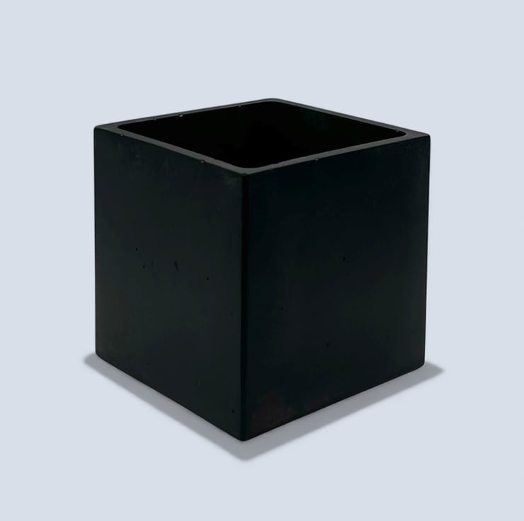 Black square plant pot sized at approximately 10 cm wide, 10 cm high and 10 cm long. This modern planter has a smooth stone-like finish and a deep black colour that works beautifully with many interior styles. Its simple shape and clean lines make it a striking accent for shelves, desks or small indoor plants, and it makes a lovely gift for plant lovers and anyone who enjoys contemporary handmade decor.
