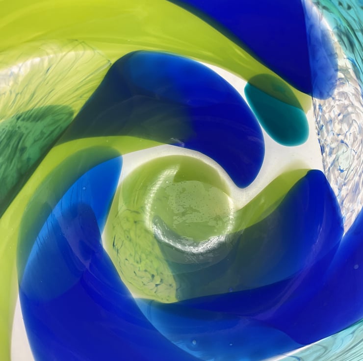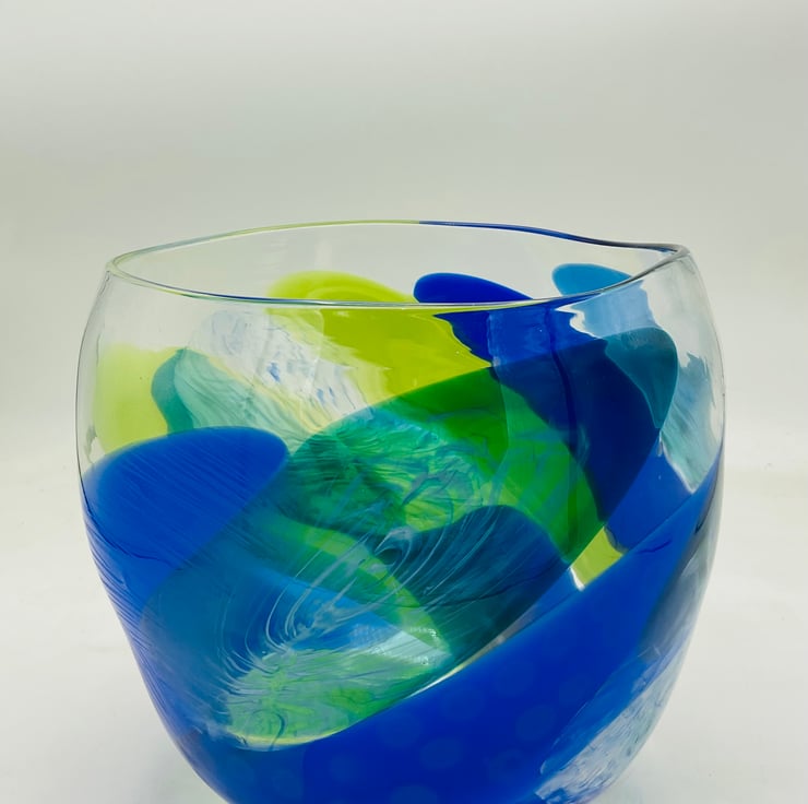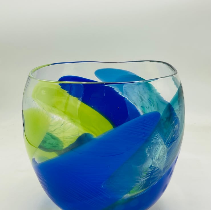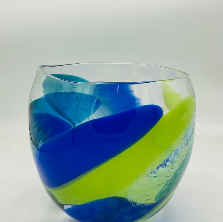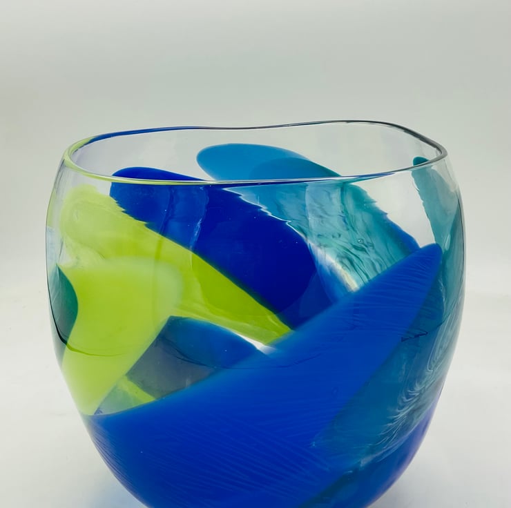 Opaque Diatom Bowl with Ripple Rim 17cms wide x 20cms high .This piece is unusual as it is made in predominantly bold opaque colours which have distorted the rim giving this piece a very distinctive organic flow to it.