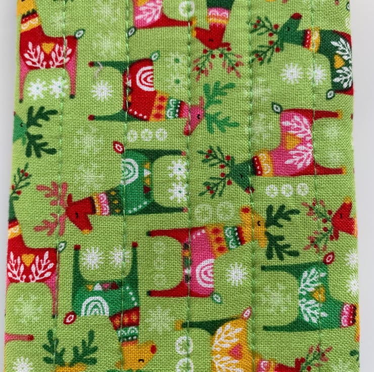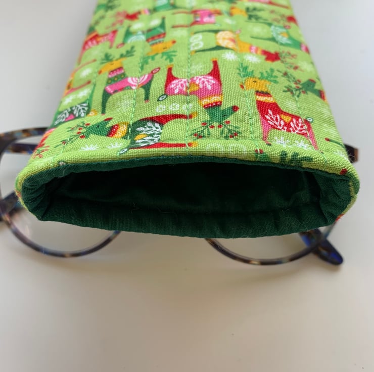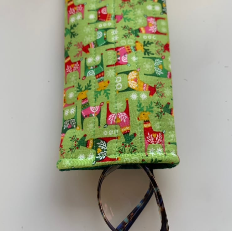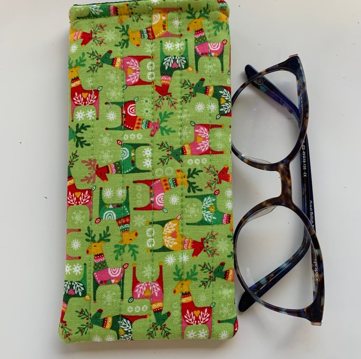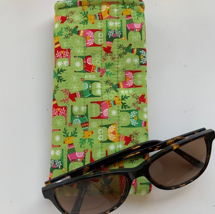 The padded slip in style glasses/sunglasses case is made in this fun colourful reindeer design print fabric.