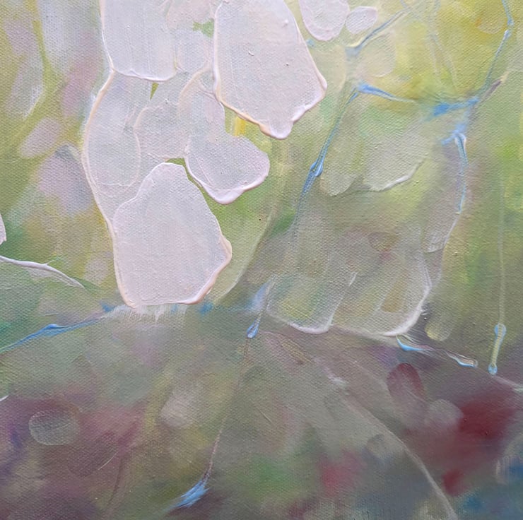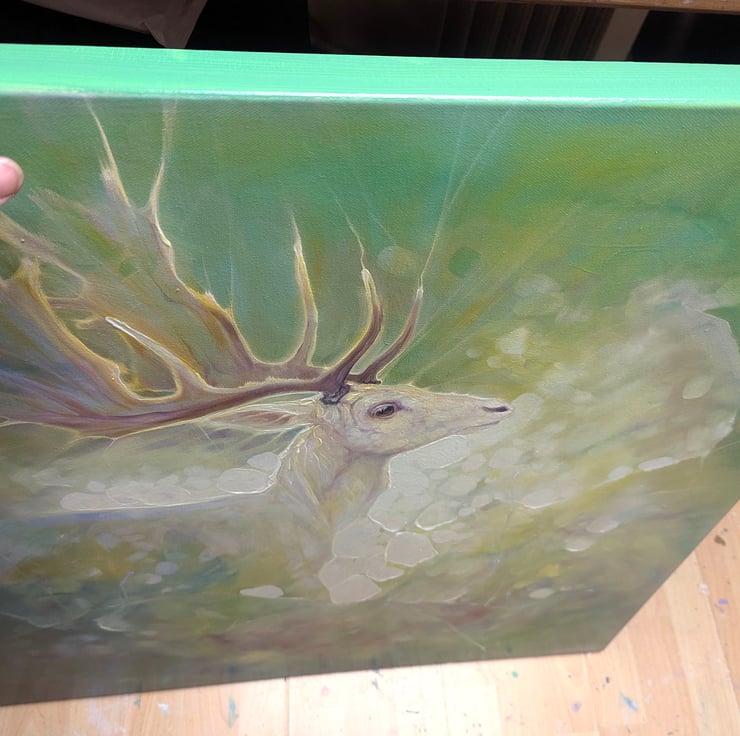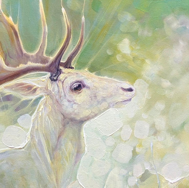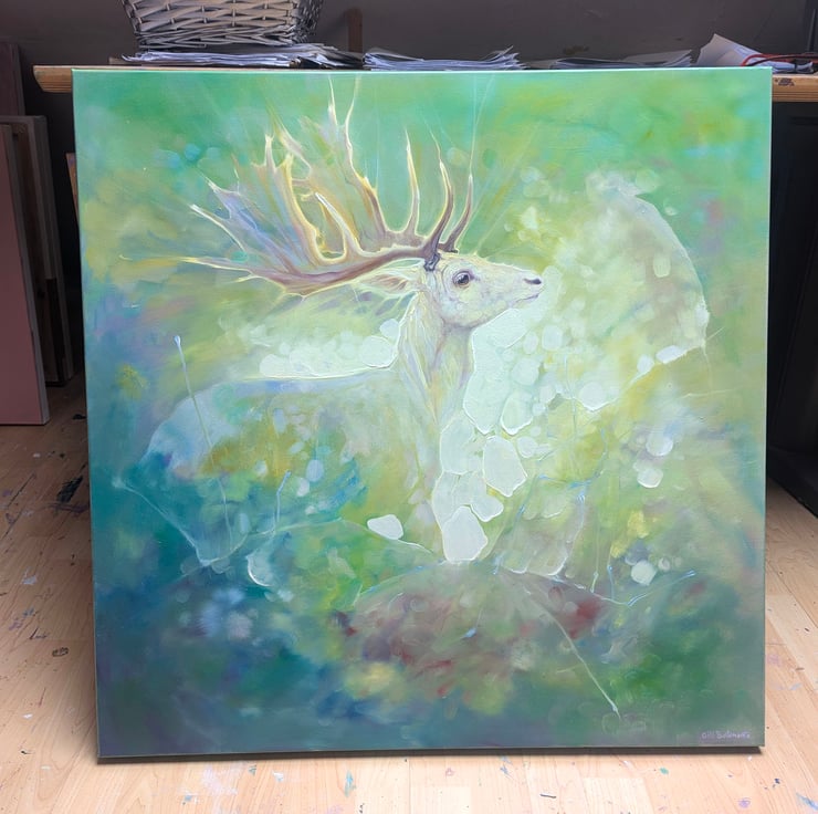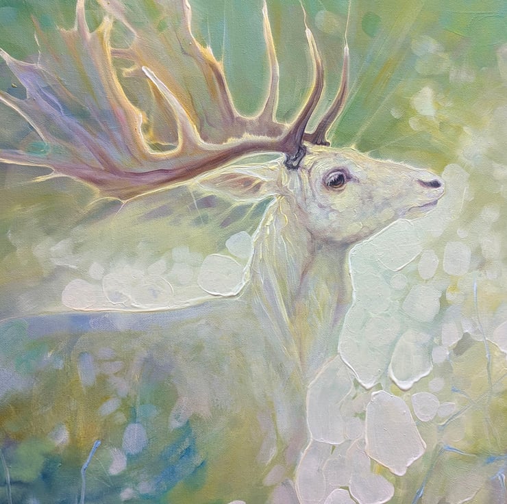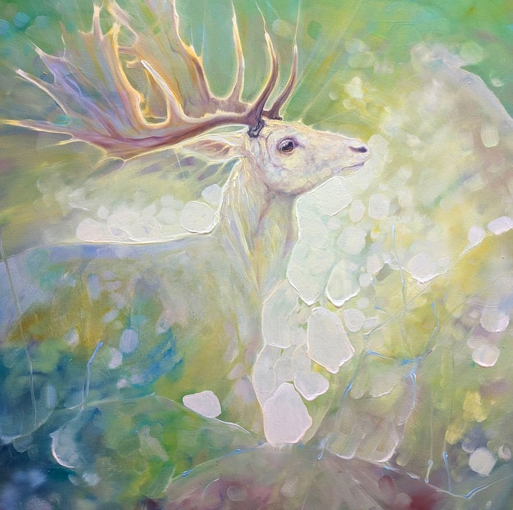 White Hart Rising is semi abstract contemporary oil painting of a white deer stag against a green and rainbow coloured abstract background. It is 30x30x1.5 inches. The inspiration for the painting is spotting fallow deer in the Sussex area. Deer look like ethereal creatures to me anyway but a white deer is even more so. In folklore deer are often revered as spirit guides or messengers and it is interesting how this idea crosses so many cultures. Painted on deep edge canvas, edges green, ready to hang and comes with certificate of authenticity.