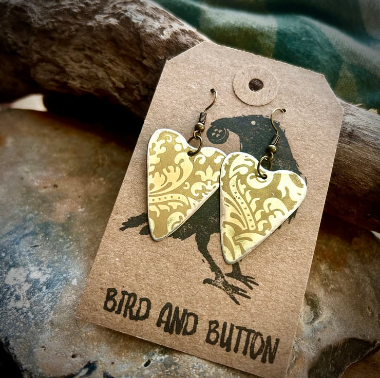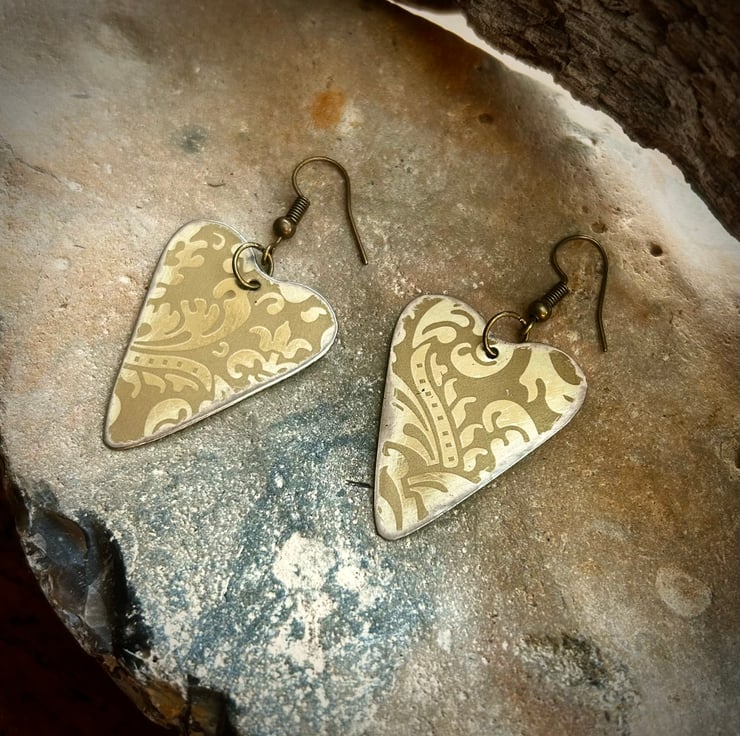 These heart-shaped earrings were cut from an M&S shortbread tin.
