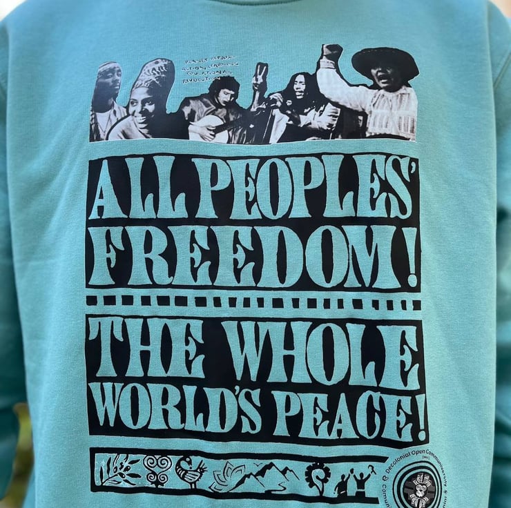 This Planet Repairs inspired shirt shouts clearly: ‘All People’s Freedom! The Whole World’s Peace!’ - alongside key ancestors and symbols was designed as part of our ongoing commitment to promoting and being part of building the Decolonial Open Communiversity!