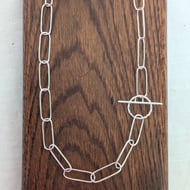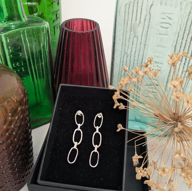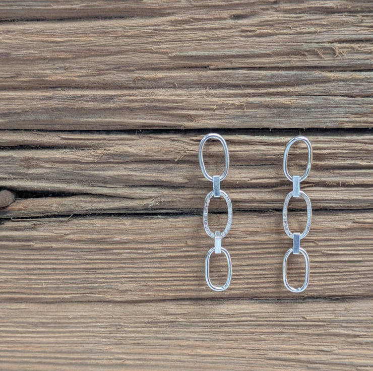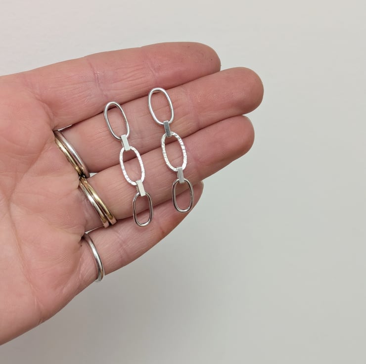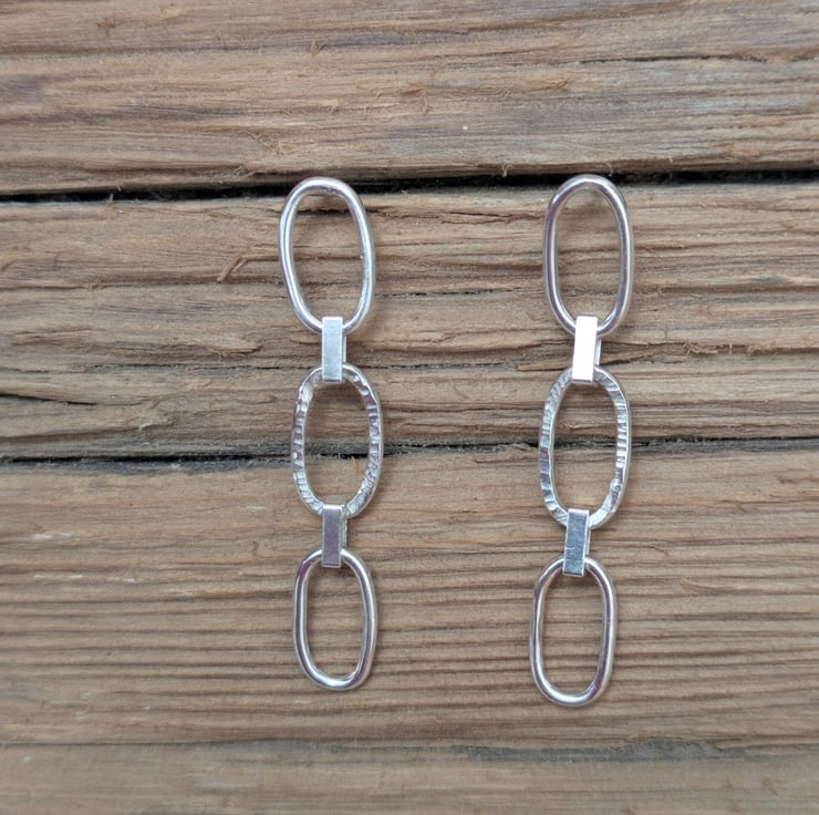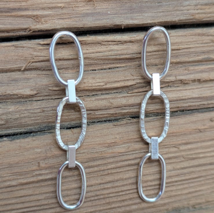 Solid sterling silver earrings handmade in Sheffield. Three chain links with alternating textures, joined by rectangular links.