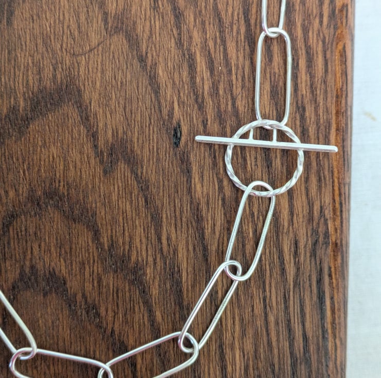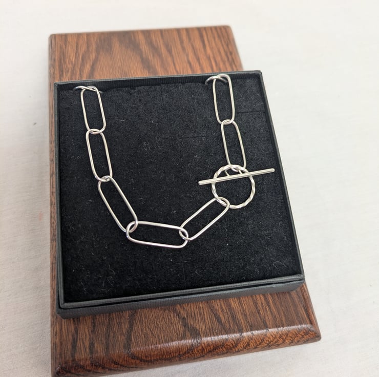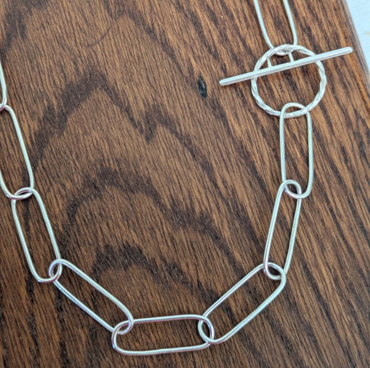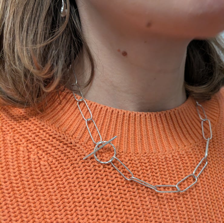 A solid silver paperclip chain, handmade in Sheffield. A little piece of luxury made for everyday wear. Each link is fully soldered, and made to last. The clasp can be worn to the side so it's visible for some extra detail, or worn at the back of the neck.