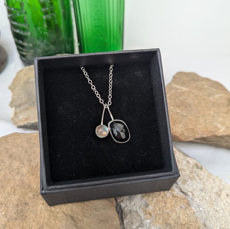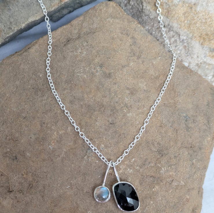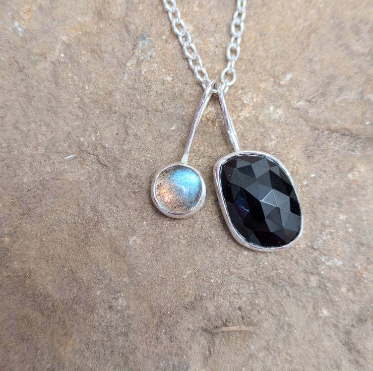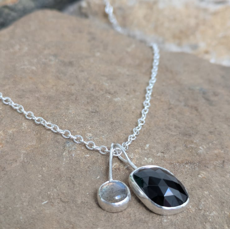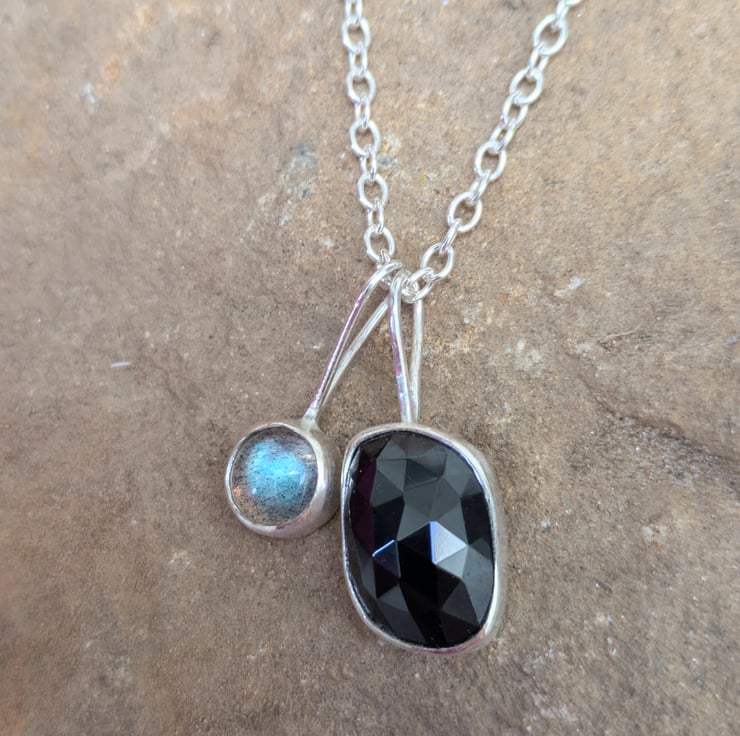 A unique sterling silver pendant necklace, handmade in Sheffield. Featuring a faceted black spinel, and a beautiful labradorite stone. They can be worn together, or you can remove a pendant and wear separately, so there's 3 ways to wear it!