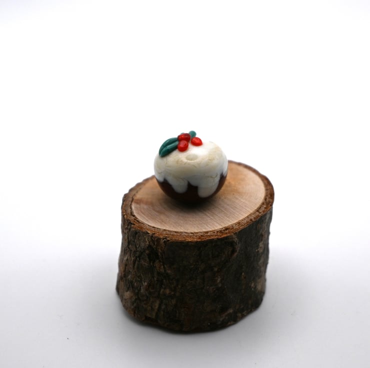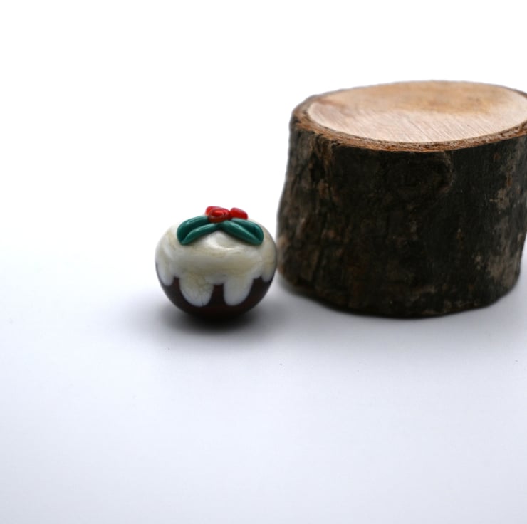 A small glass Christmas pudding made by hand using a technique called lampworking.