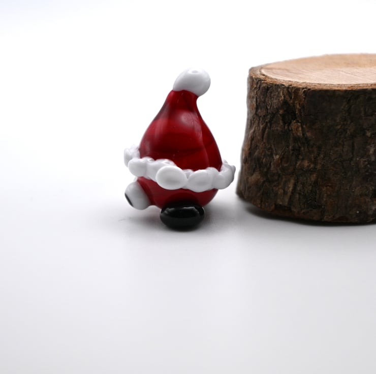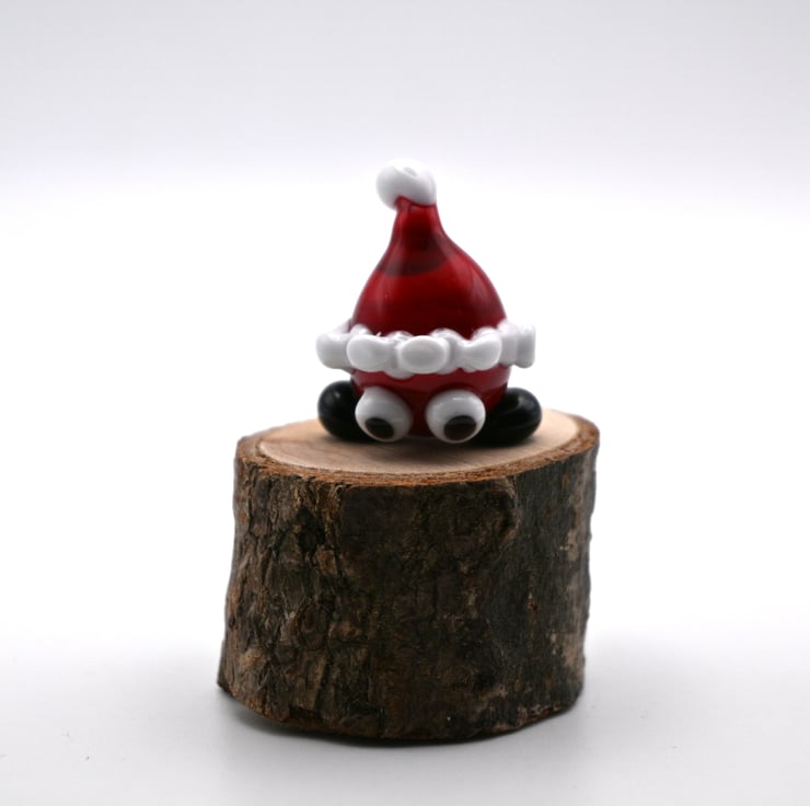 A small glass christmas hat figure made by hand using a technique called lampworking.