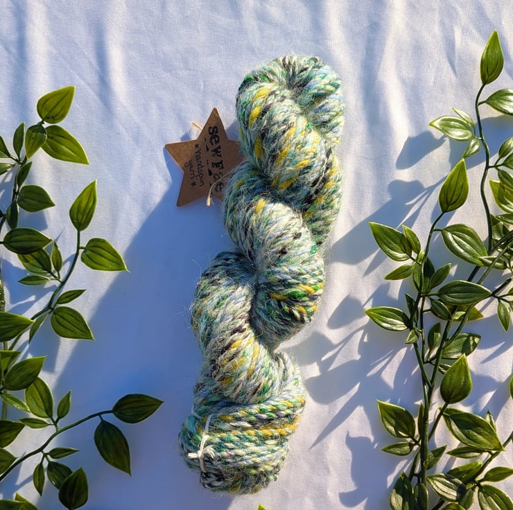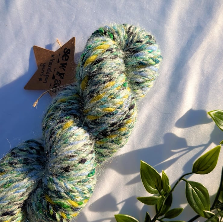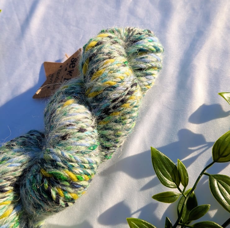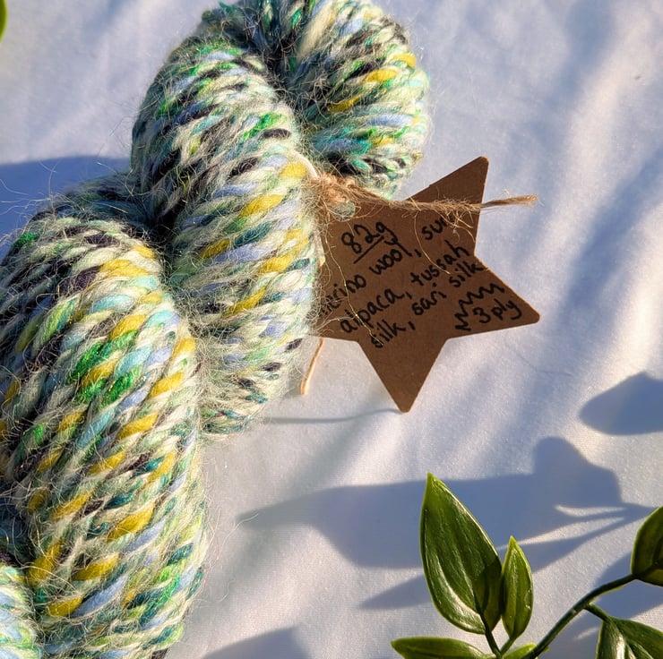 A handspun 3-ply art yarn, plied with a super soft suri alpaca lace weight yarn for the dreamiest squishy texture! The colours are reminiscent of soft waves crashing across a blue-green sea.