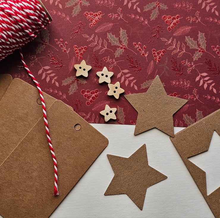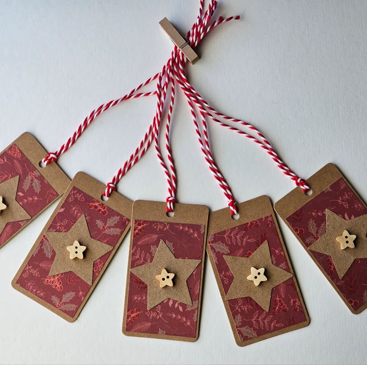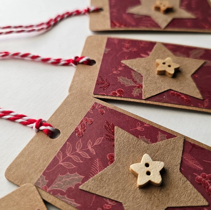 The tags are 9cm x 5 cm (3.5" x 2"). The materials used are: brown kraft labels, patterned paper, brown kraft card star shapes, wooden star buttons and red and white twine.