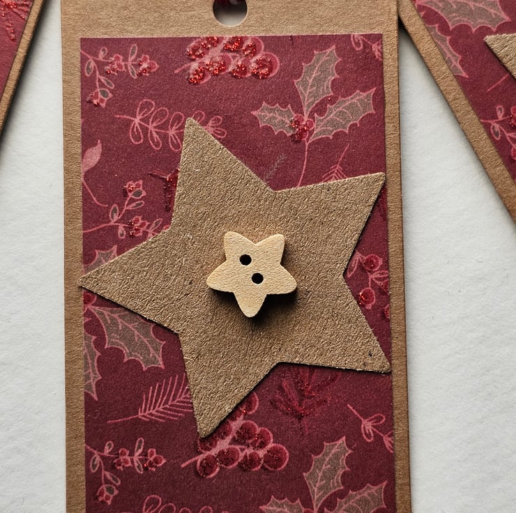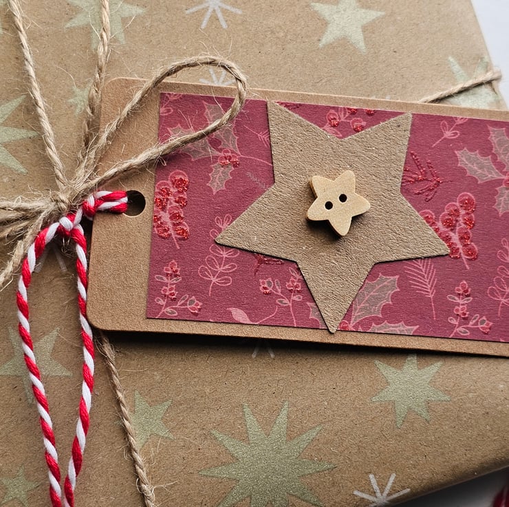 Some lovely unique gift tags to enhance your gifts. They were made using offcuts of pretty red leaf patterned paper and recycled brown card.