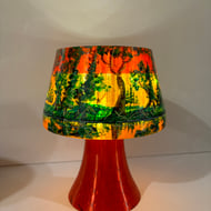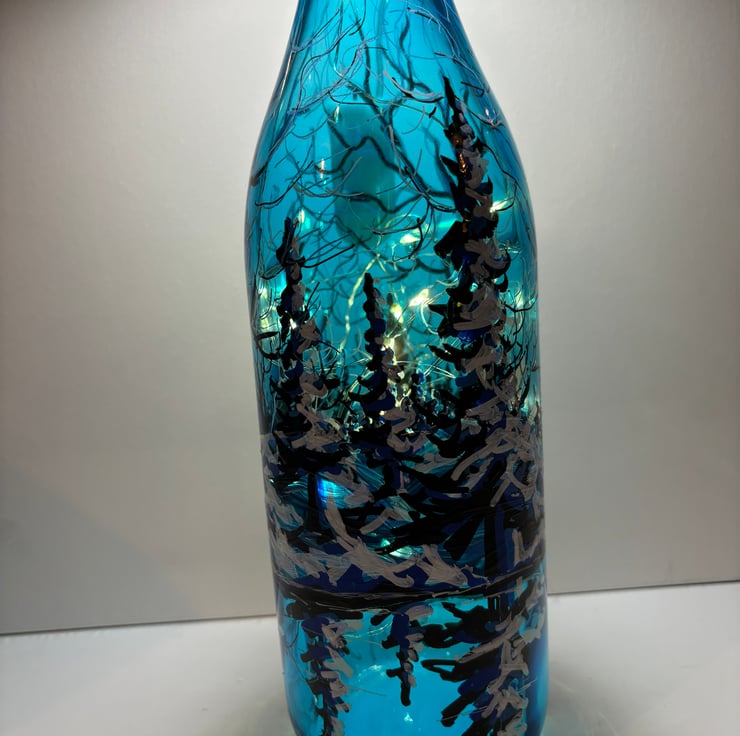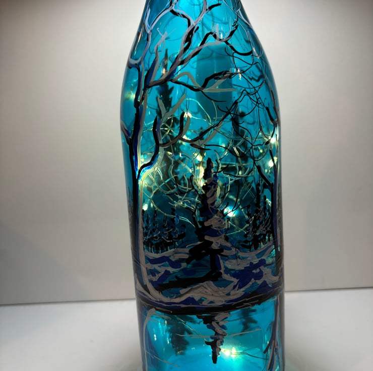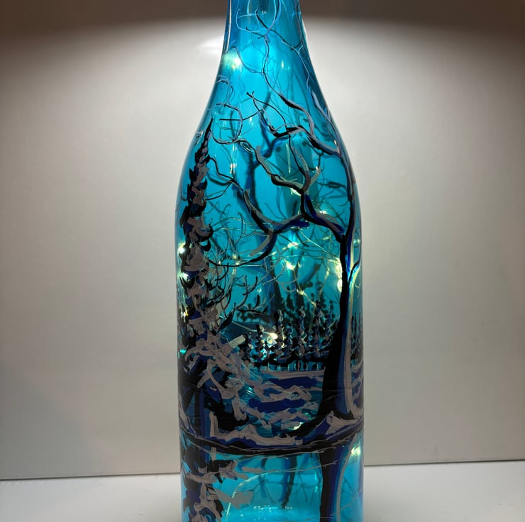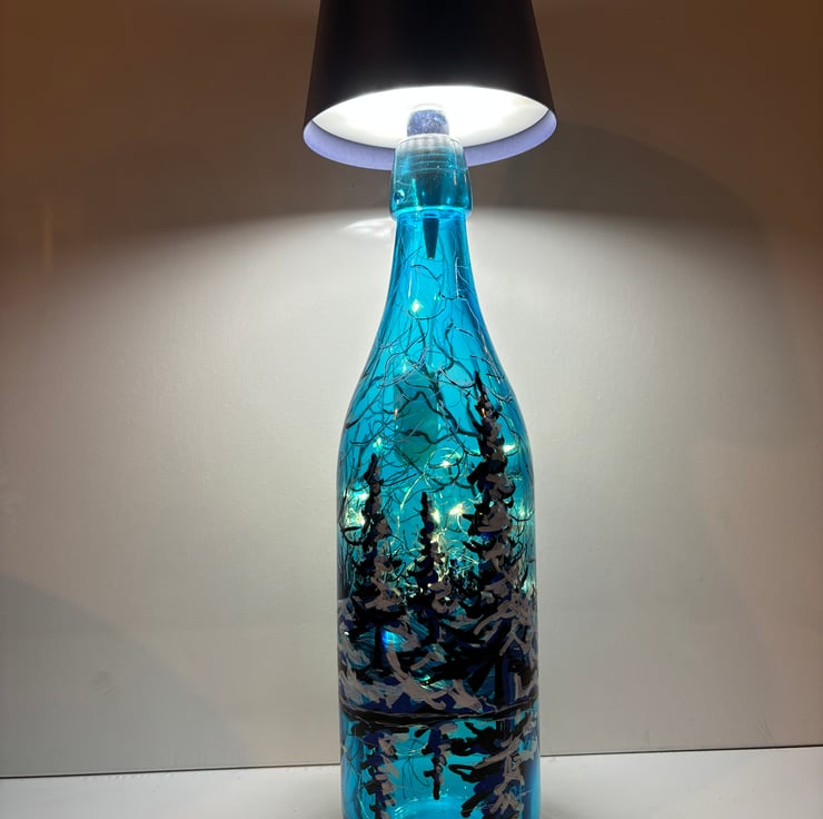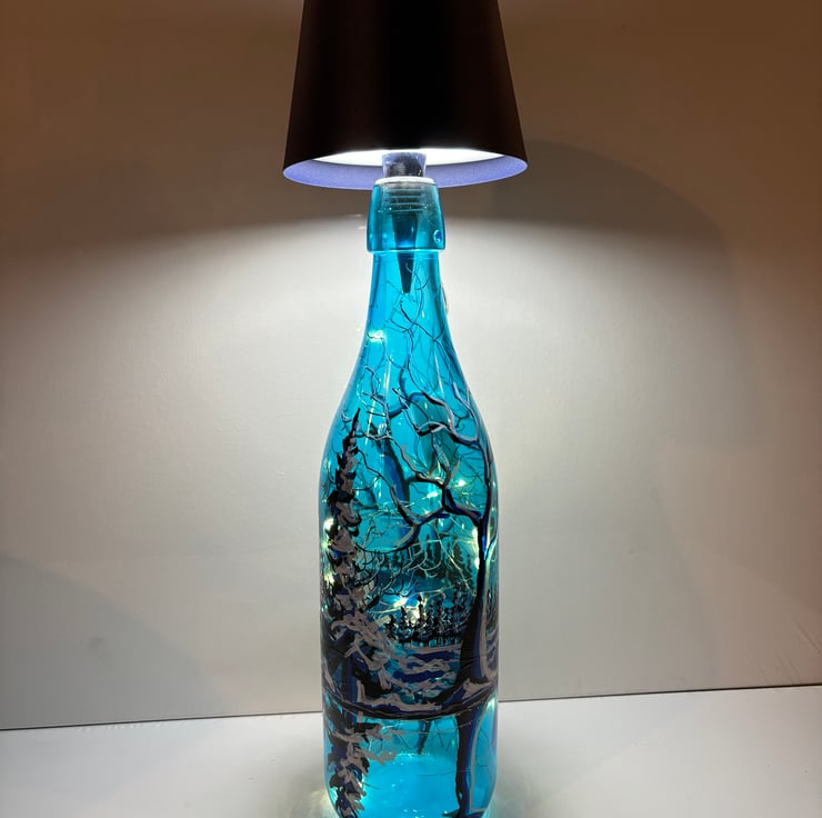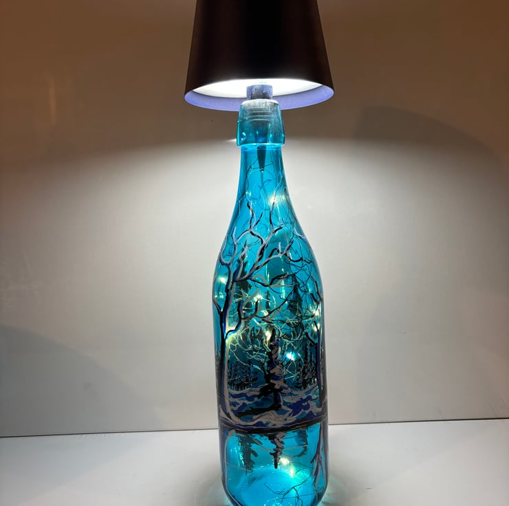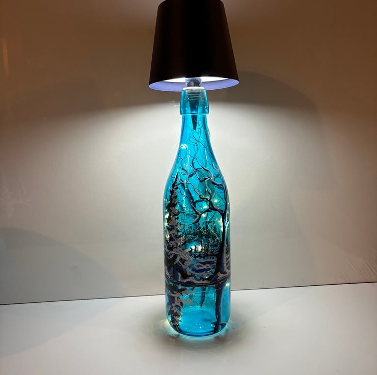 A hand painted and fired glass bottle lamp by Andrew Jenkins