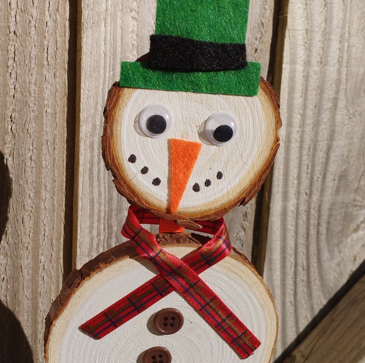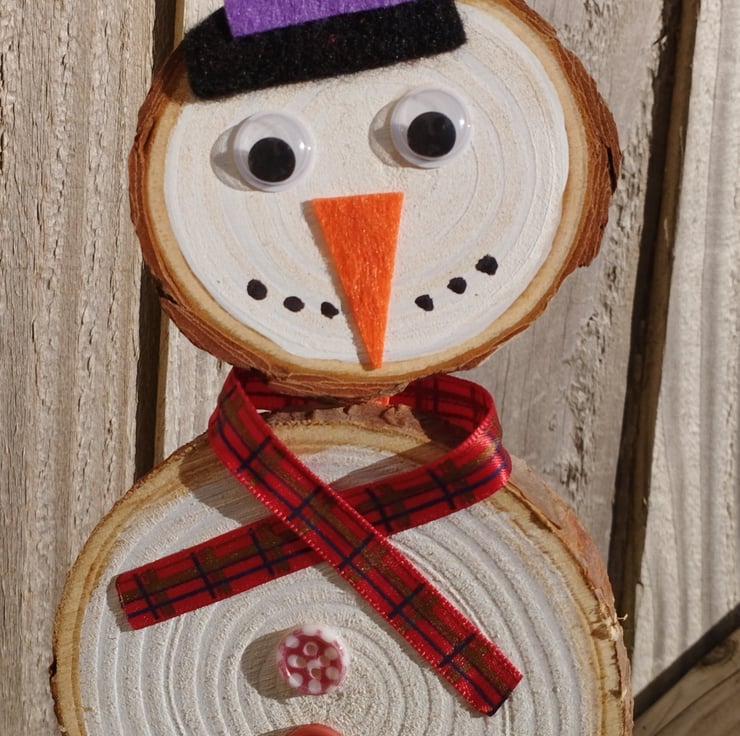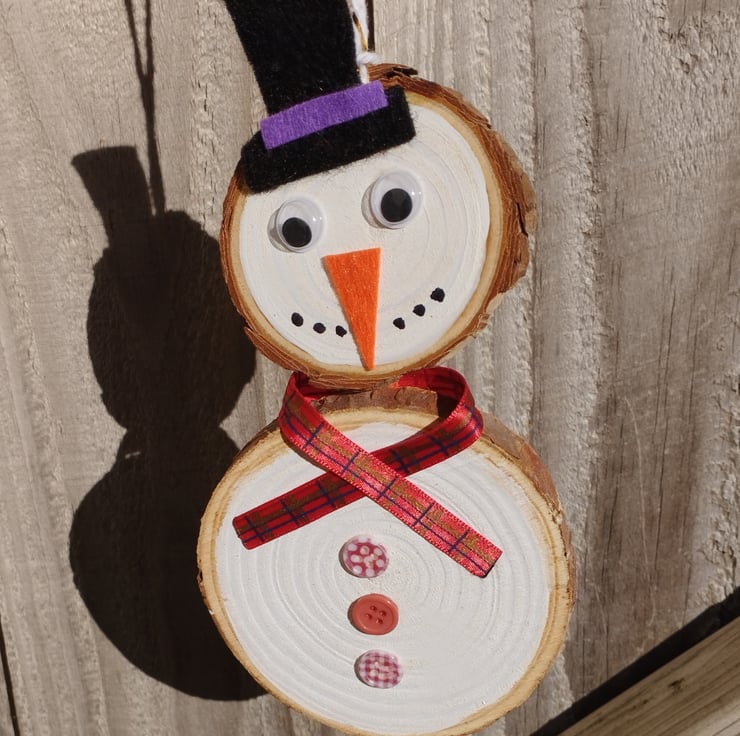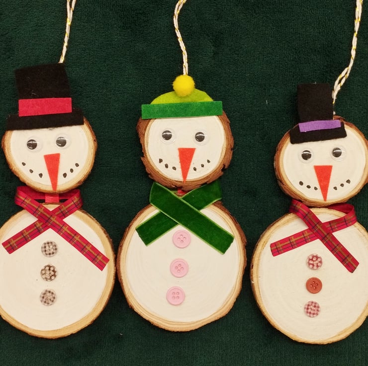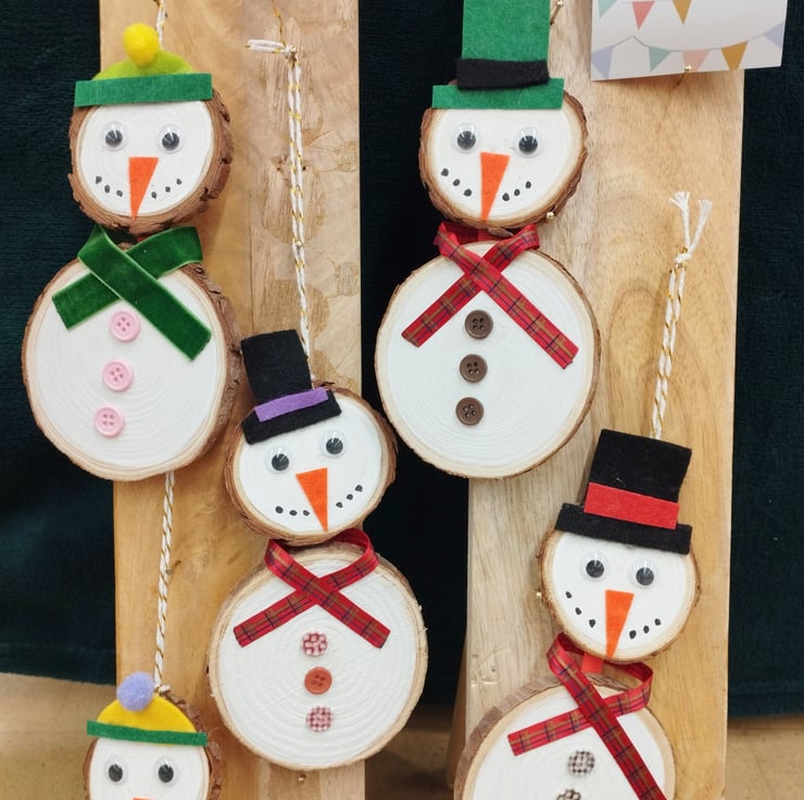 Hanging wooden snowman Christmas decorations. Each individually decorated with scarf, hat and buttons.