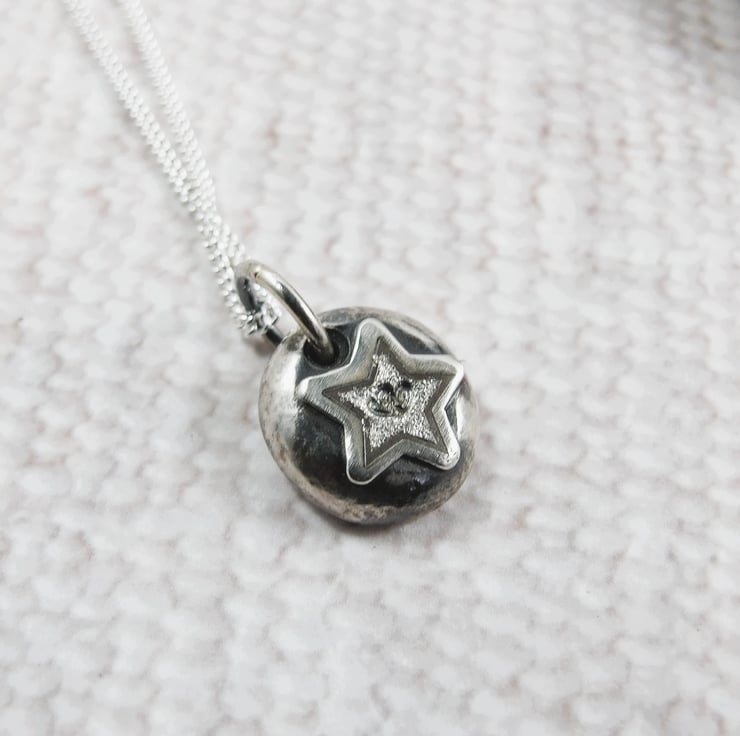 I have made the pebble shape by heating sterling silver to melting point where it forms a natural pebble shape. Once cooled I have soldered on a star shape and a bail. Once this was done I etched a star pattern with a laser tool to highlight the star shape and then hand stamped two tiny interlocking hearts at the centre. Fitted to an 18 inch .925 Sterling Silver Chain.