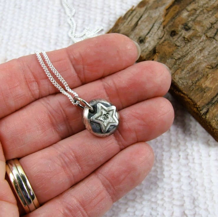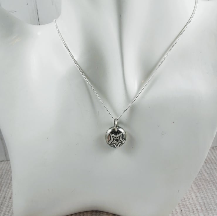 Silver Pebble Necklace. Applique star textured etched with a star outline and hand stamped with two tiny interlocking hearts at the centre on 18 inch sterling silver chain.