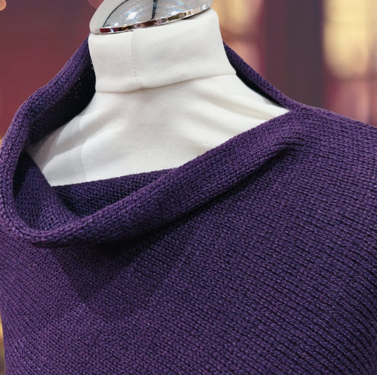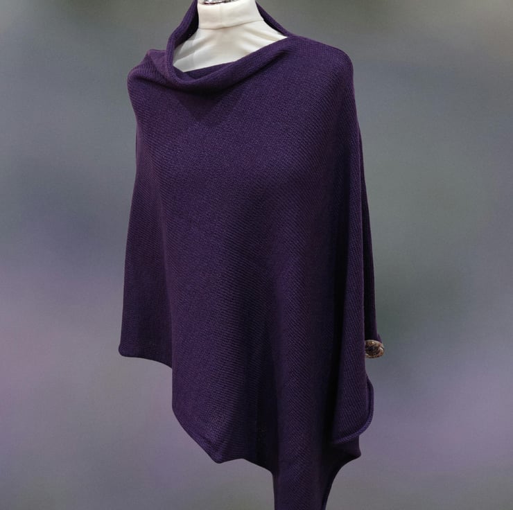 Wrap yourself up in this comfy merino wool poncho in a fabulous aubergine. A larger size poncho to keep you warm in winter, perfect for layering. Decorated with one of my hand crafted buttons made from resin and heather, this exquisite piece reflects the natural beauty that inspires all of my pieces. Individually created for you, it pairs seamlessly with my matching beanie, cowl, and fingerless gloves. Discover the ultimate blend of elegance and warmth, crafted to elevate your winter wardrobe.