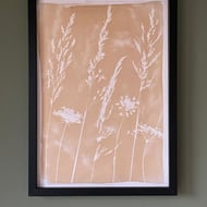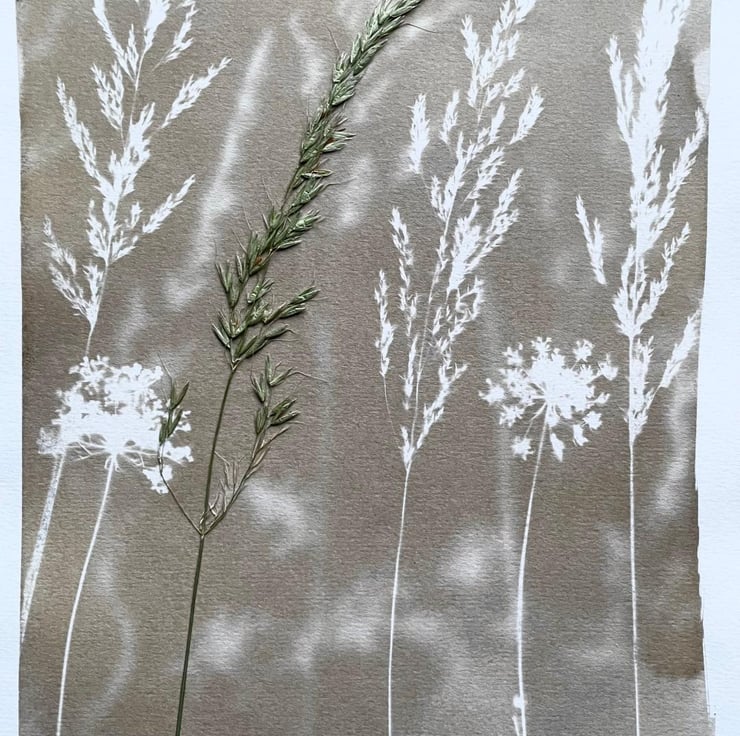 An original cyanotype print influenced by the beauty of a wildflower meadow. This print uses layers and double exposure to celebrate the calming influence of being in the countryside, highlighting the natural textures and harmonising colours through the pressed grass.