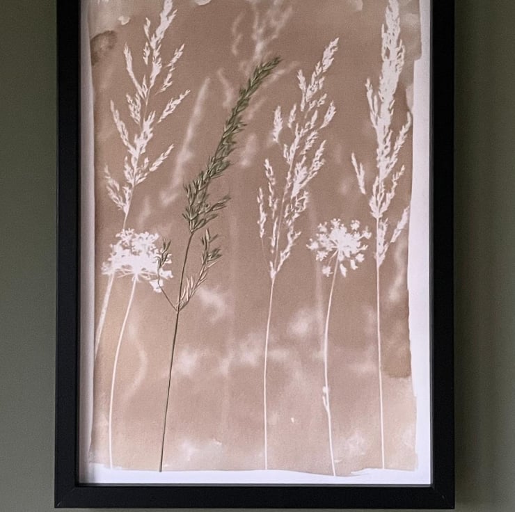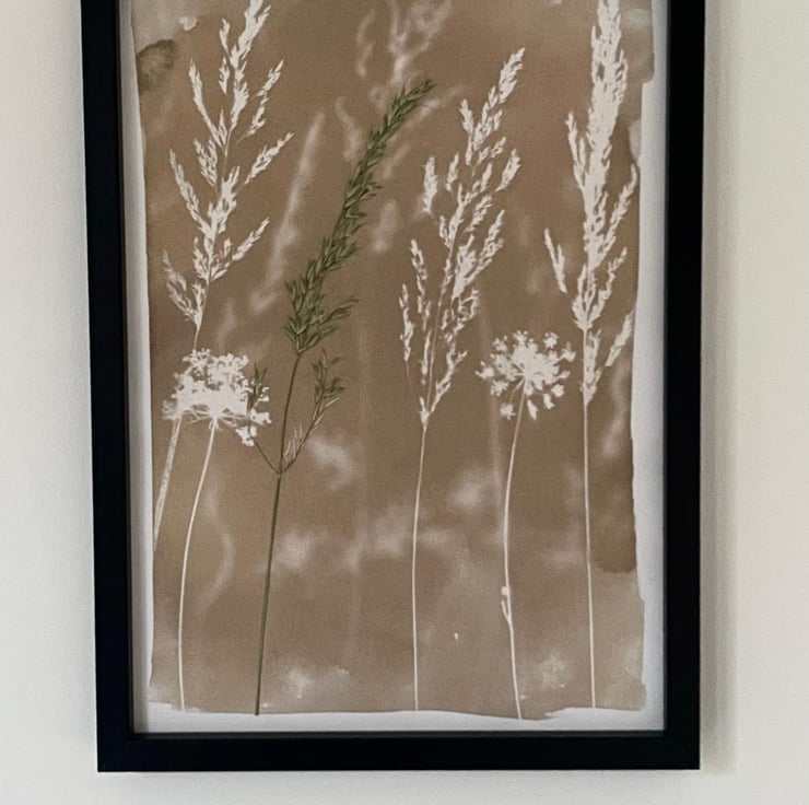 This cyanotype is bleached and dyed in a green tea solution to produce the soft brown hues that compliment neutral decor. Again, like the process of creating a cyanotype, the process of dying a cyanotype is completed fully by hand and so tones and colours vary. The slight unpredictability of the technique adds to its appeal to me as each print is truly original.