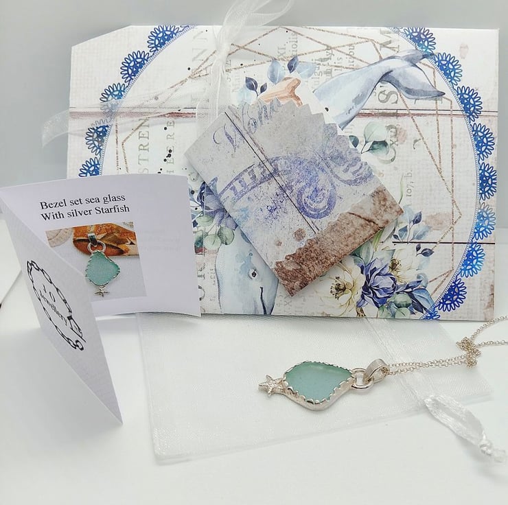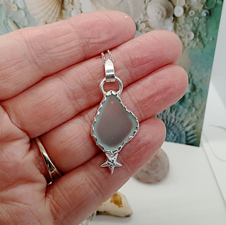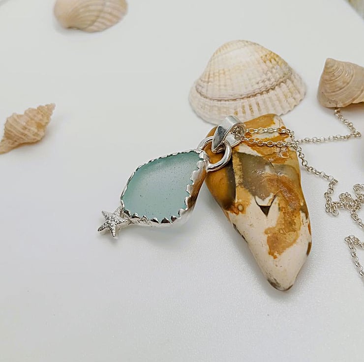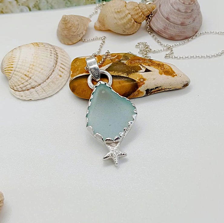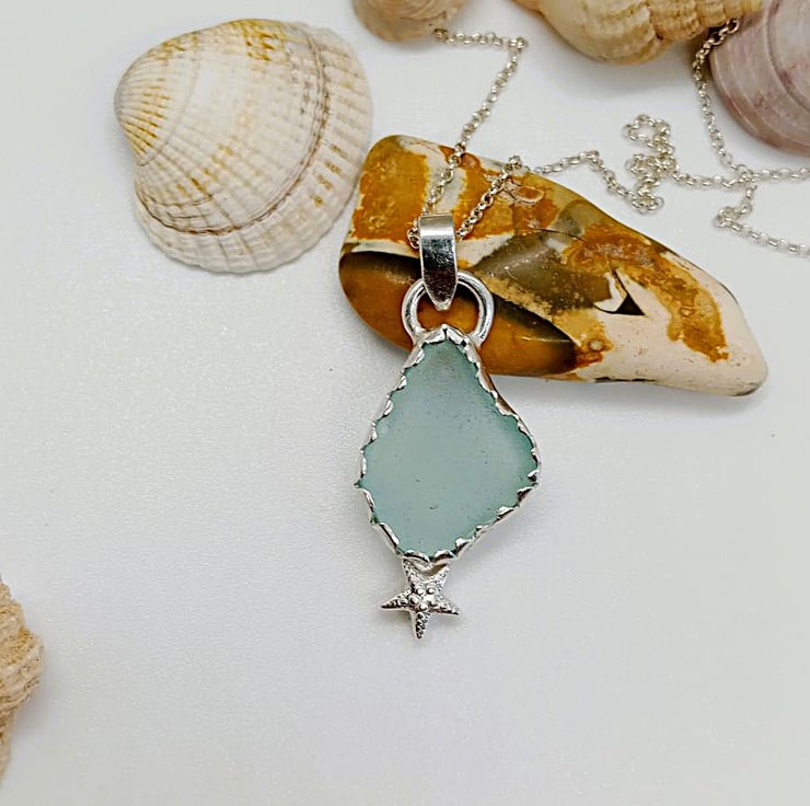 Green Aqua Sealass necklace with silver starfish, a piece of natural tumbled Aqua sea glass from Filey beach north yorkshire is hand set in a sterling silver bezel setting with a solid sterling silver starfish at the bottom.