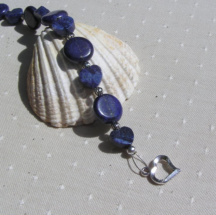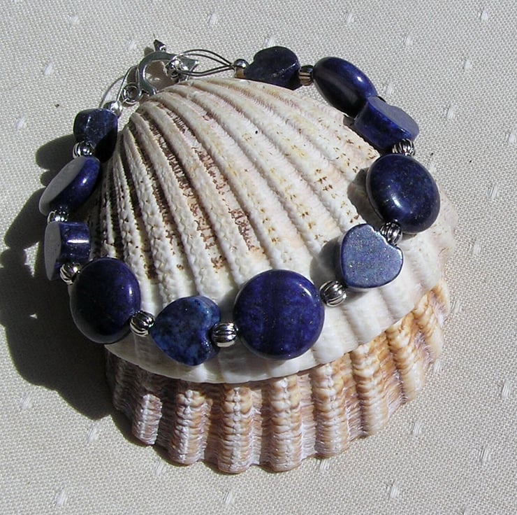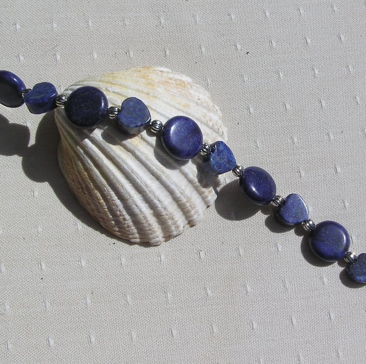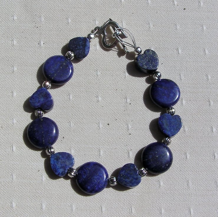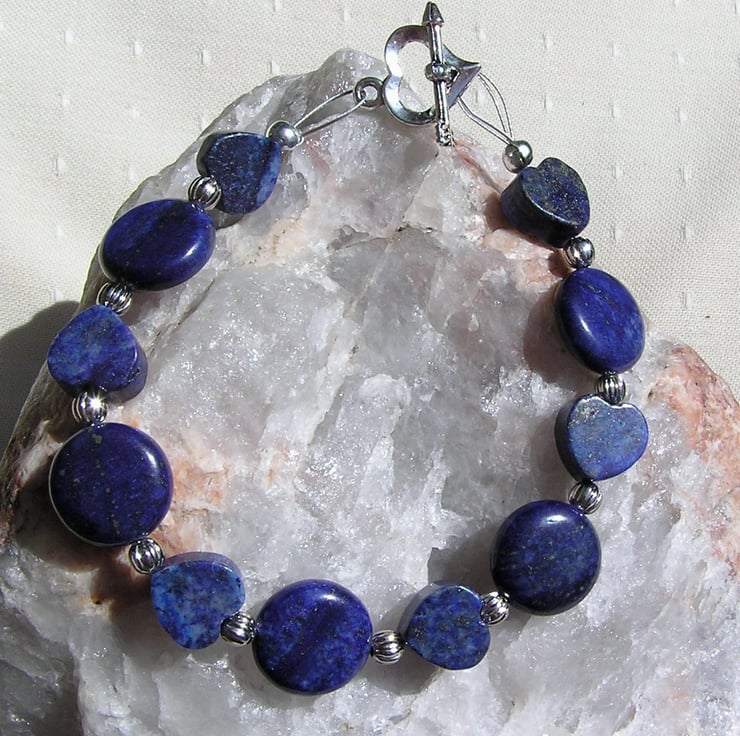 This Stunning Bracelet is made wholly from Lapis Lazuli... alternating Solid Heart beads & flat coin-shaped beads separated by glistening Tibetan Silver spacer beads - A Beautiful combination for either the casual look or wear it with something more Elegant for a Special Evening out