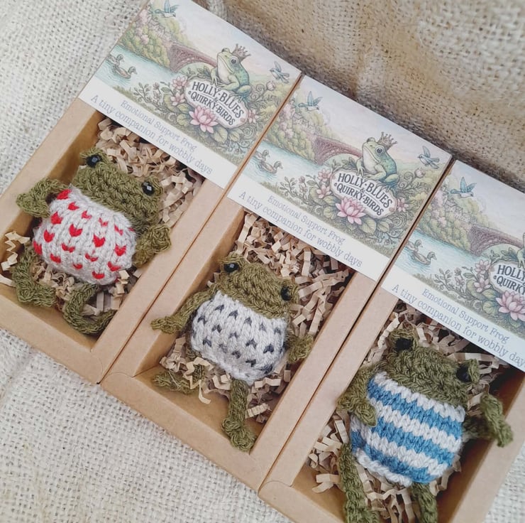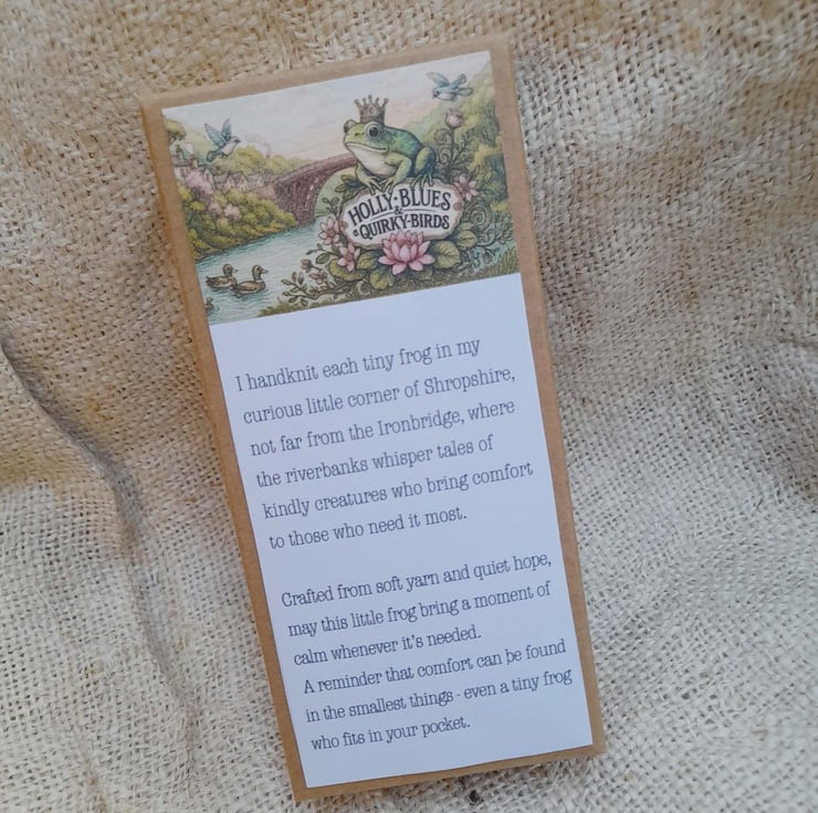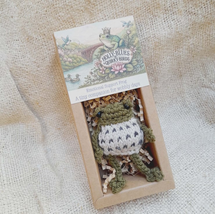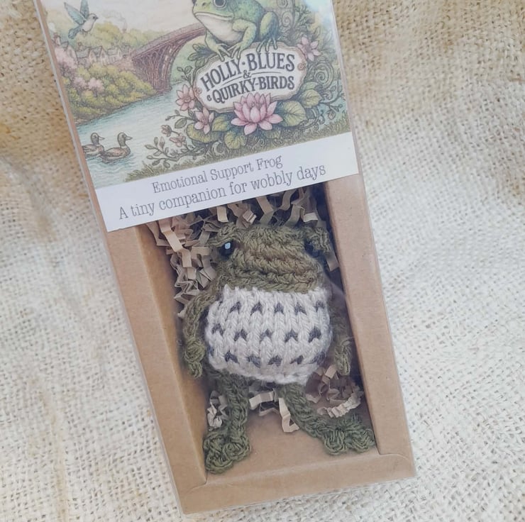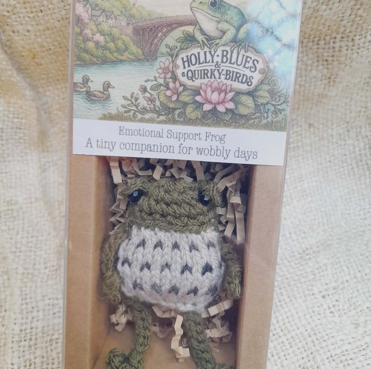Meet Thimble, a tiny hand-knitted emotional support frog, made with quiet care in my curious little corner of Shropshire.