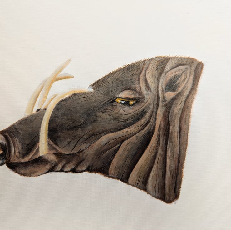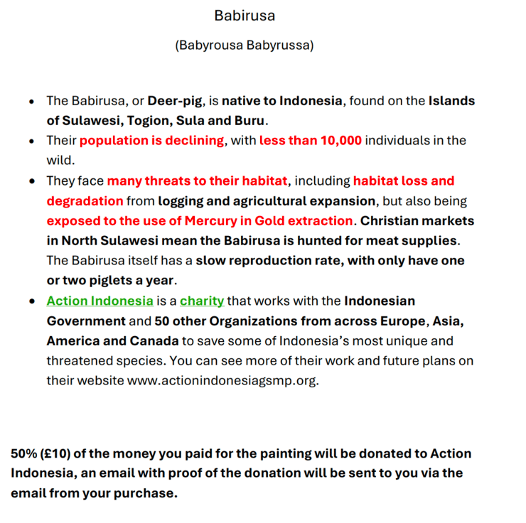 This acrylic painting on a 12" x 9" canvas depicts a portrait of the Babirusa, also known as the Deer-Pig, a threatened Indonesian wild pig, please see the third image for more personal information on the Babirusa, or visit the charity website Action Indonesia to learn more about their conservation efforts for the animals.