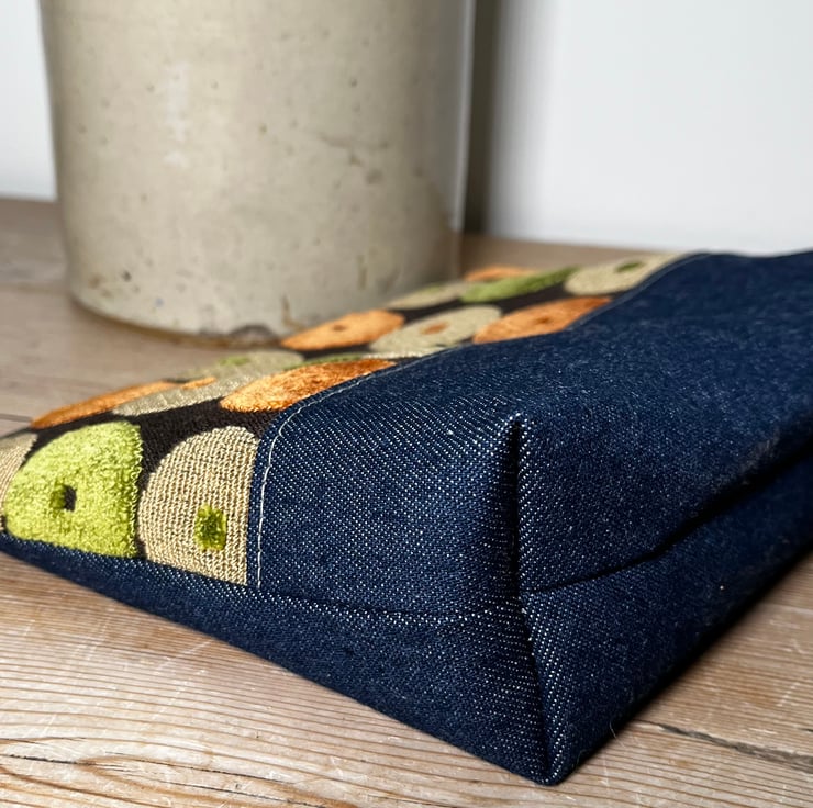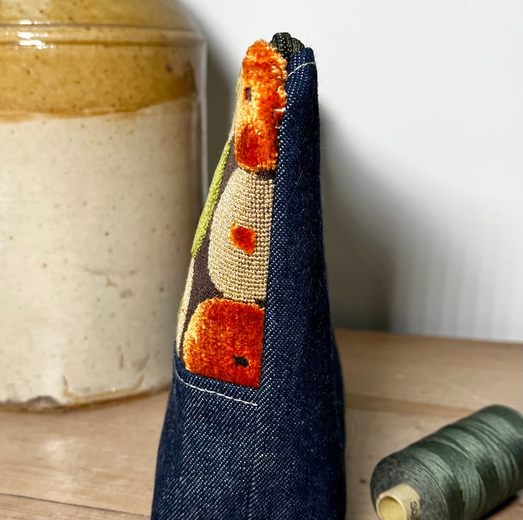 One of a kind zip pouch made from a sample swatch of textured chenille upholstery fabric and dark blue denim. The zip pull has a strip of leather which was from offcuts from my local upholsterer. The back is plain denim.