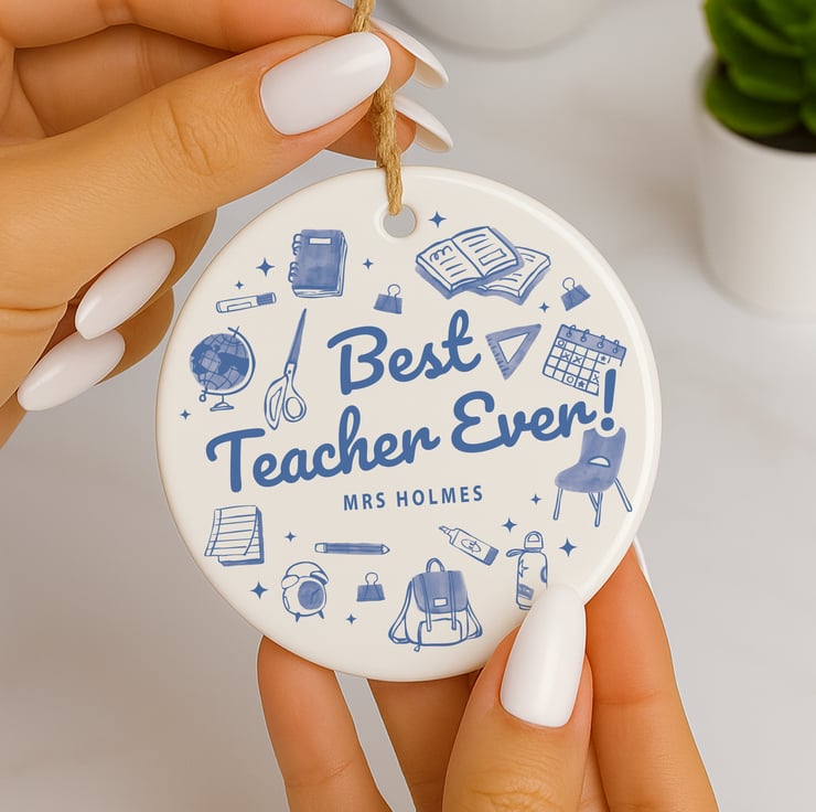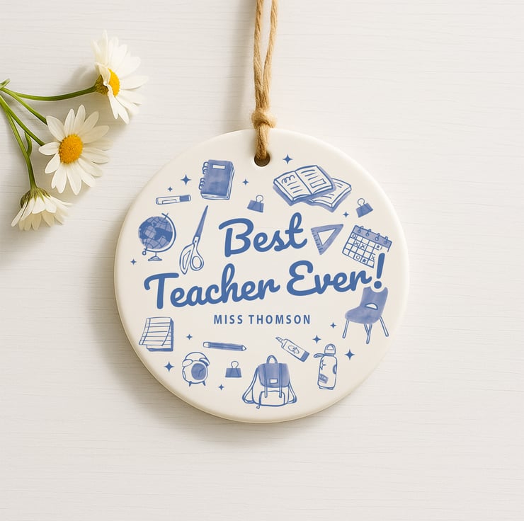This personalised “Best Teacher Ever” ornament features a charming hand-drawn blue doodle design, filled with classic school icons – books, globes, pens, backpacks and stars. Printed on a premium round ornament, it makes a heartfelt thank-you gift for teachers, TAs, nursery staff and tutors.