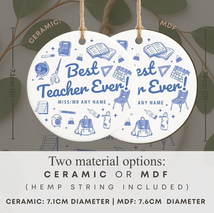 Choose from ceramic or MDF, both supplied with a natural hemp string ready to hang. Add any teacher’s name to create a unique present they’ll proudly display year after year.