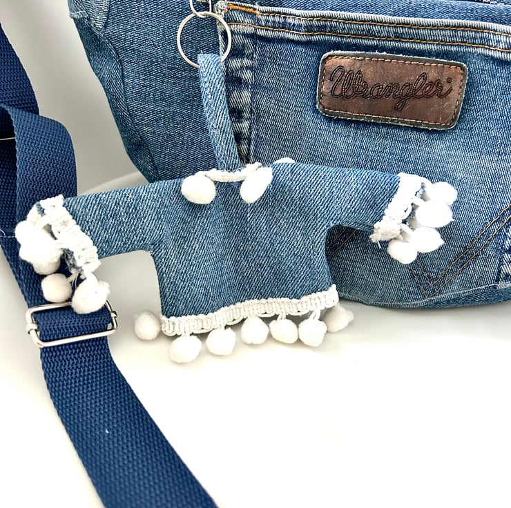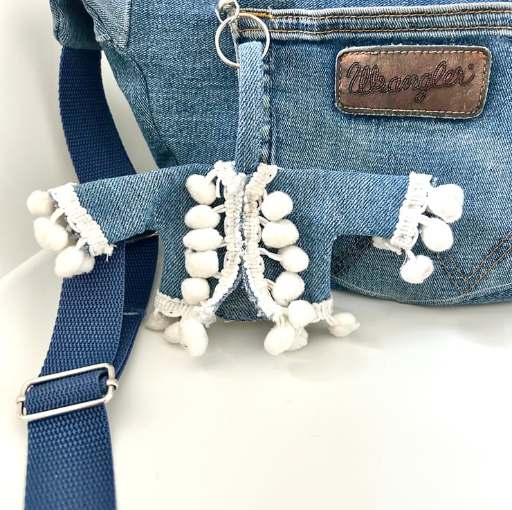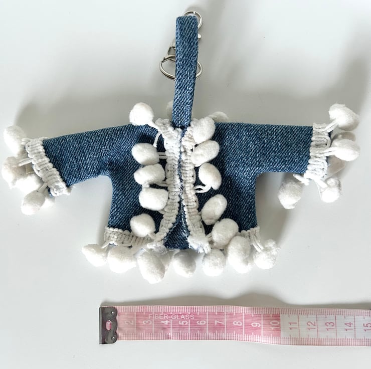 The denim is from a preloved pair of jeans. Upcycled into a denim jacket with a cute pompom trim.